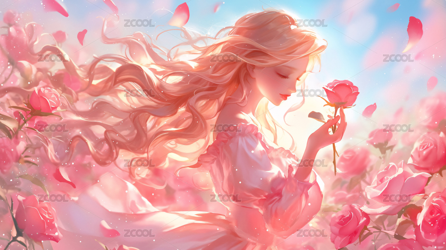 粉色唯美女王节海报 花海中捧着玫瑰的少女