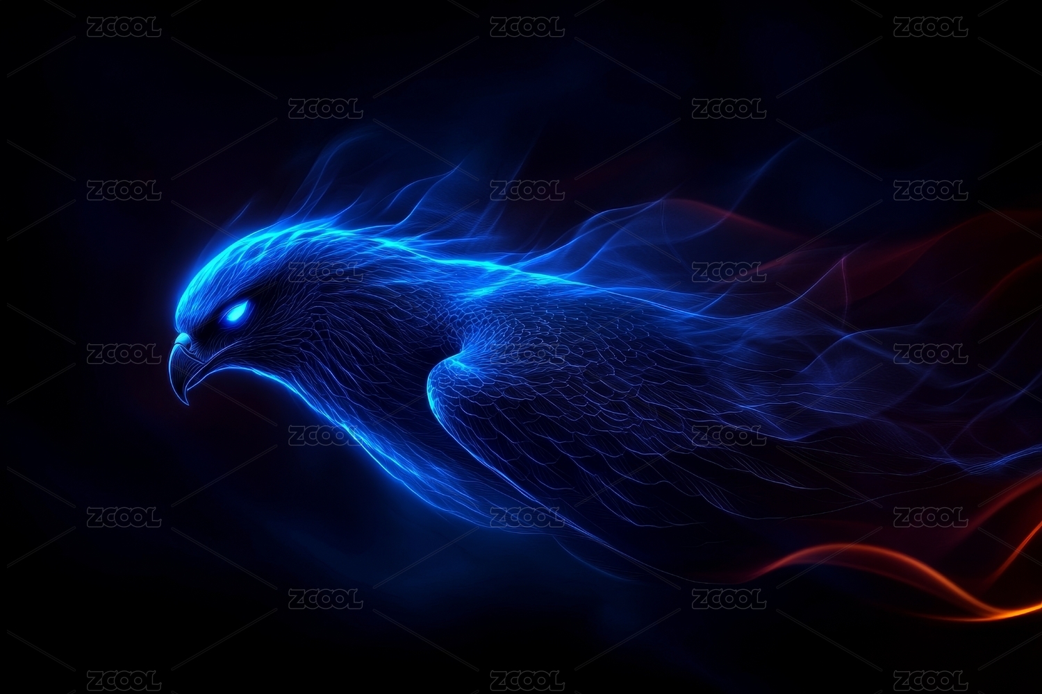 奇幻神话黑背景夜空展翅飞翔的发光神鸟插画