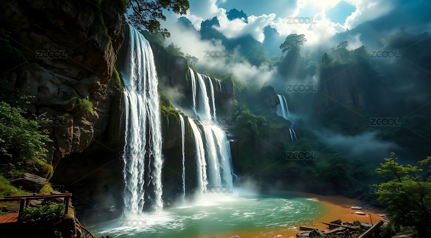 瀑布飞流直下绿潭映日云雾缭绕自然美景