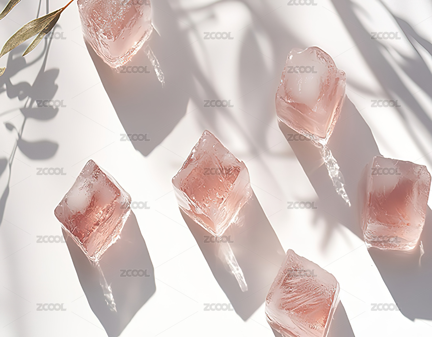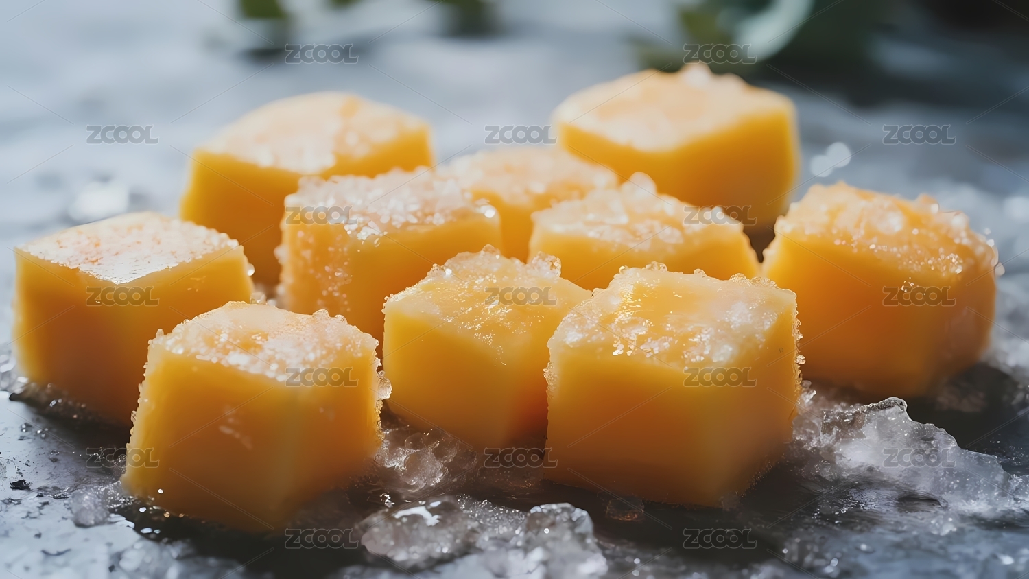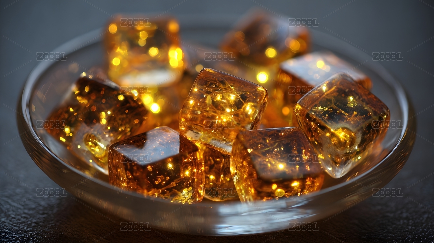 晶莹剔透琥珀冰块盛于玻璃碗中