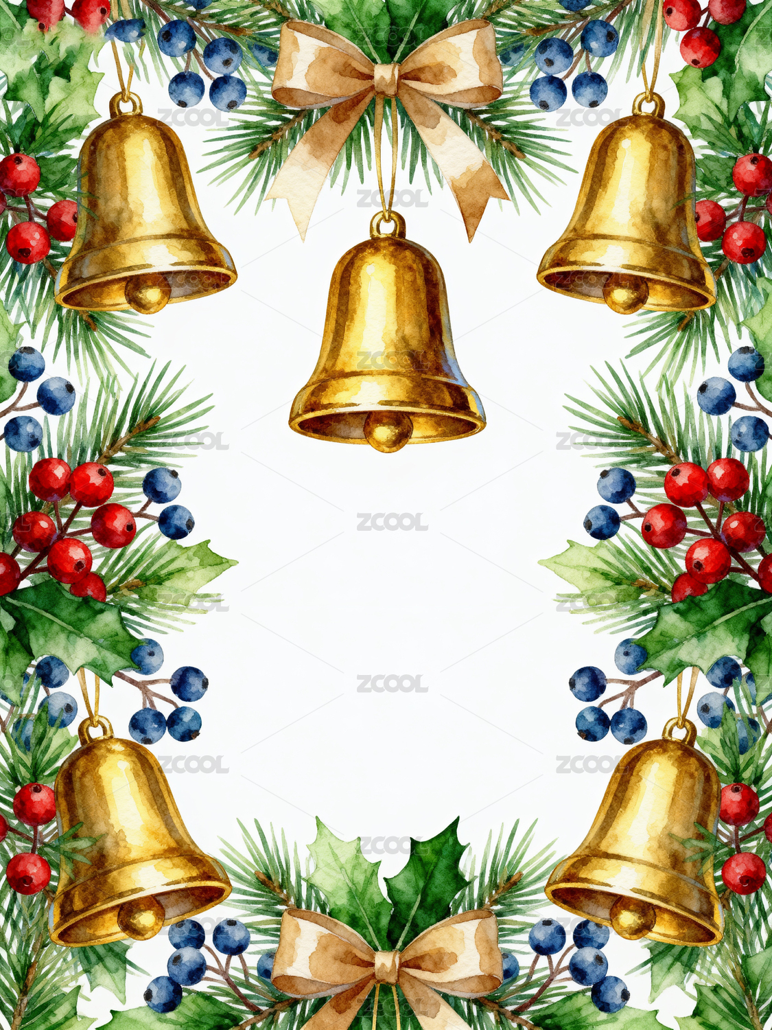 水彩手绘风圣诞节红色果实金色铃铛绿色冬青