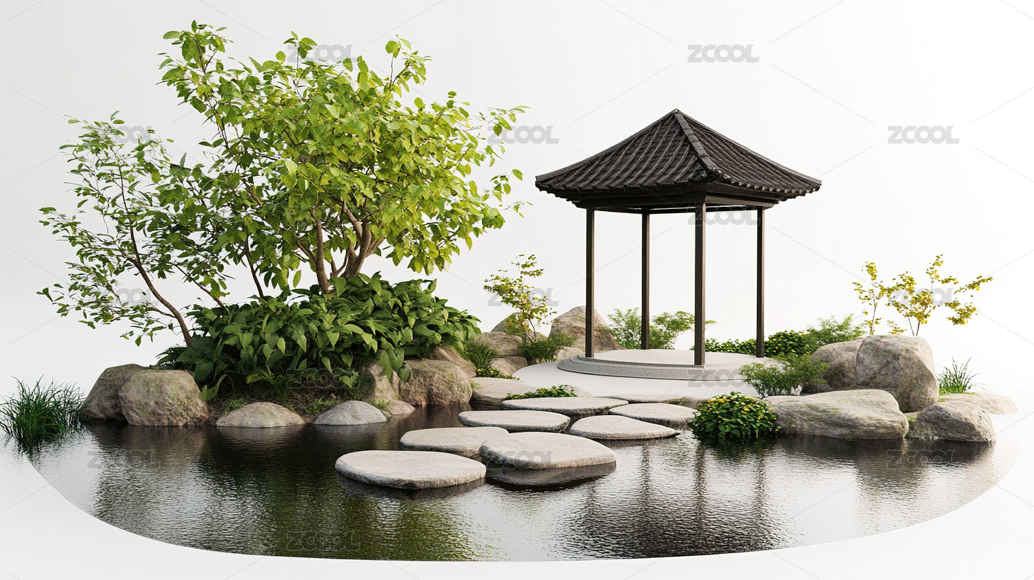 微型景观,紫色花树,小瀑布,石块,苔藓