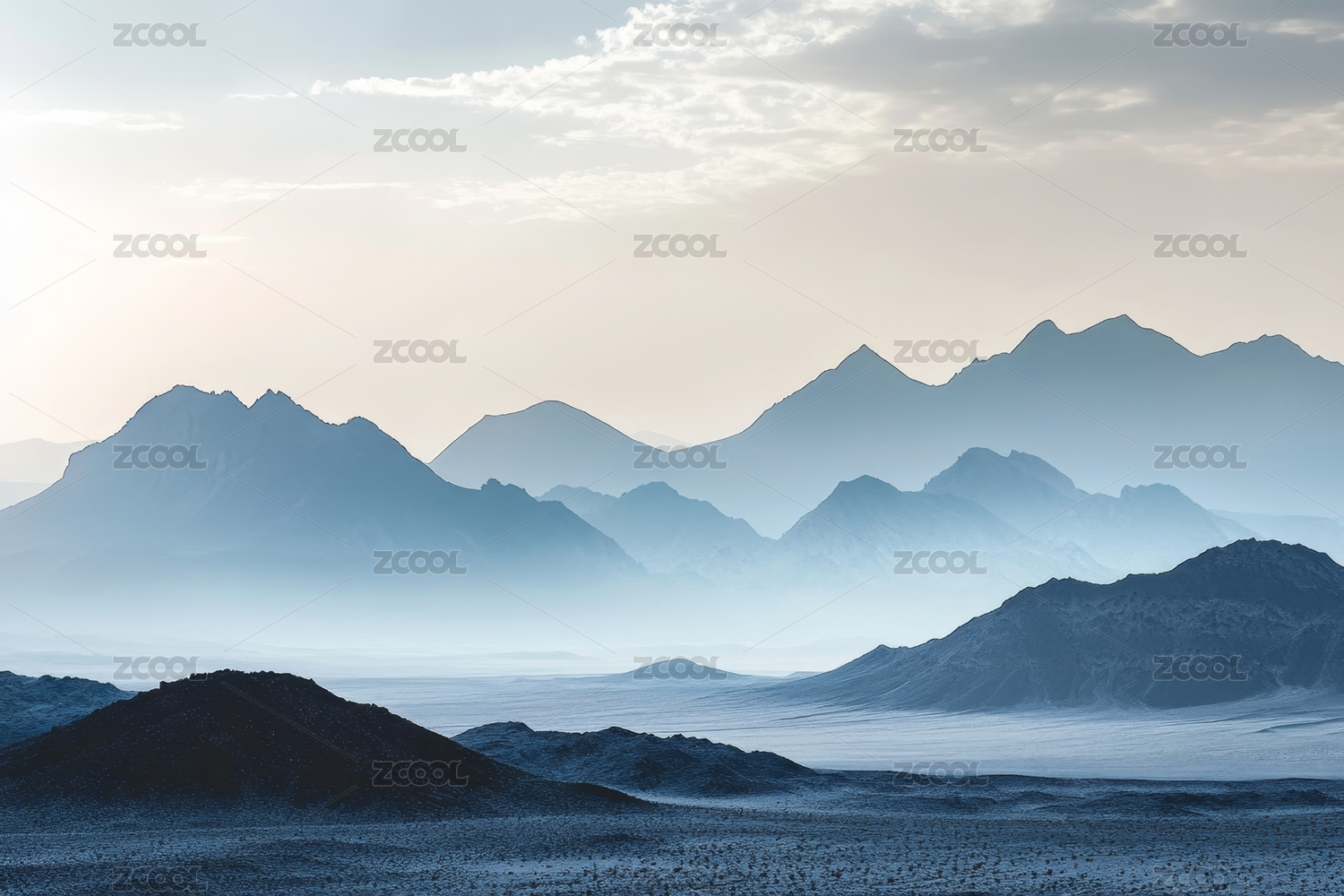 层叠山脉与薄雾笼罩的荒漠