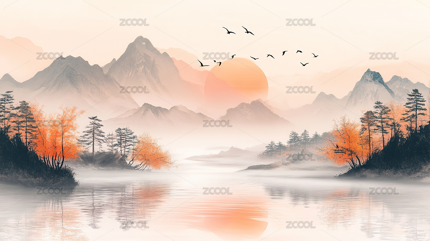 自然, 橙色, 湖泊, 秋天, 山脉, 飞鸟, 瀑布, 山水画, 红色, 秋叶