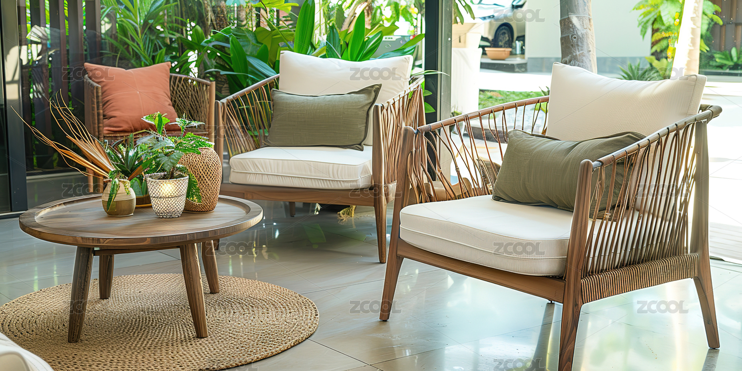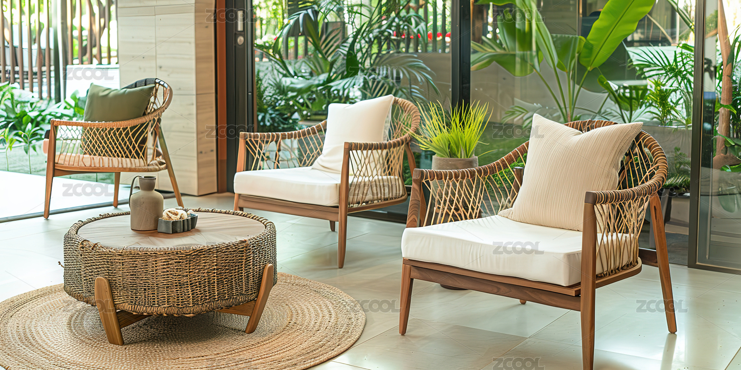 明亮室内的藤编椅与圆几