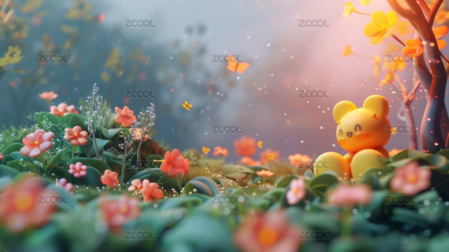 3D渲染, 温暖, 友谊, 草地, 花朵, 春天, 场景, 可爱, 治愈, 阳光