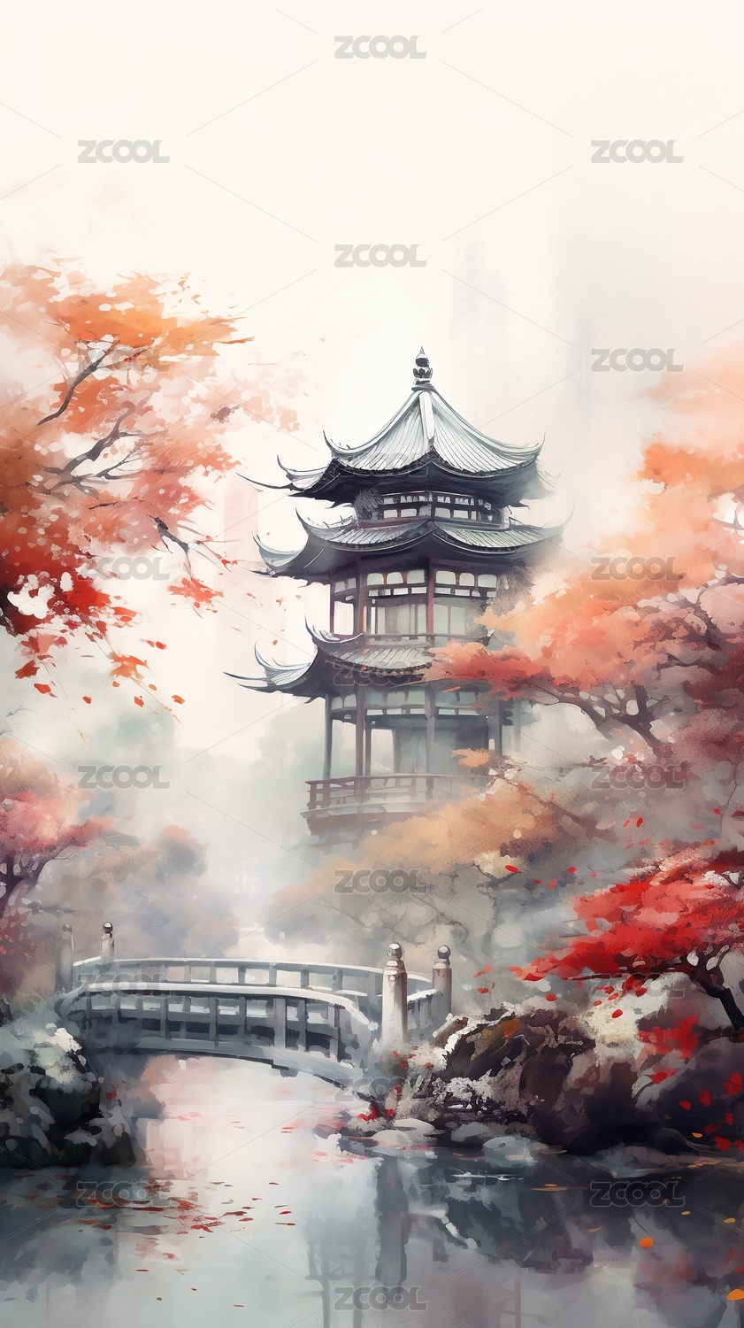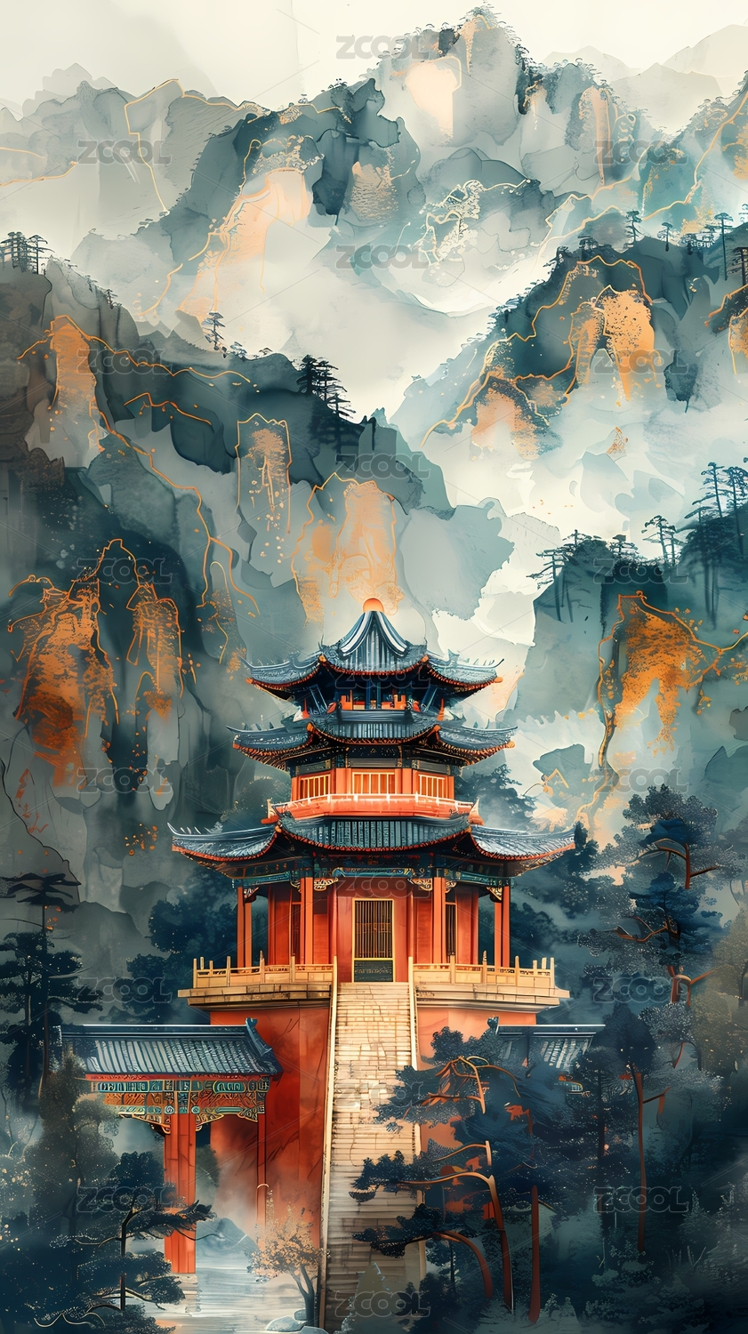 云雾,山脉,风景, 古建筑, 神秘, 传统画风, 东方艺术, 山水画, 文化遗产,中国风