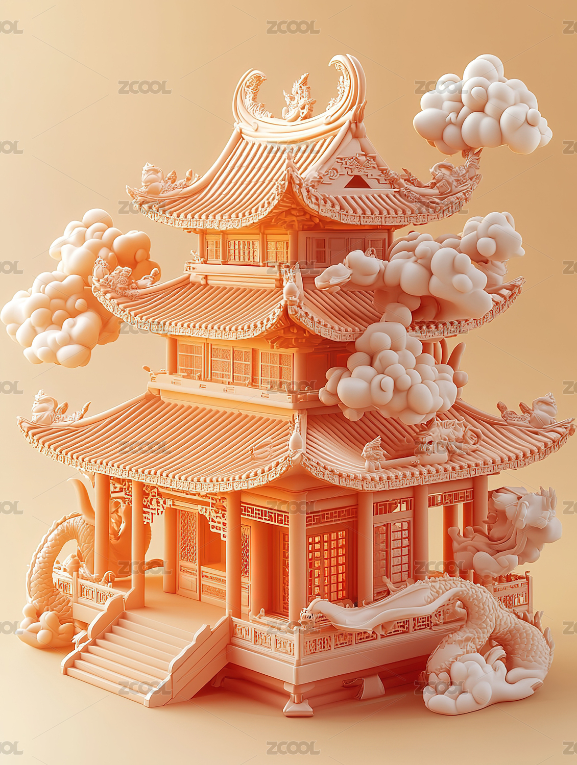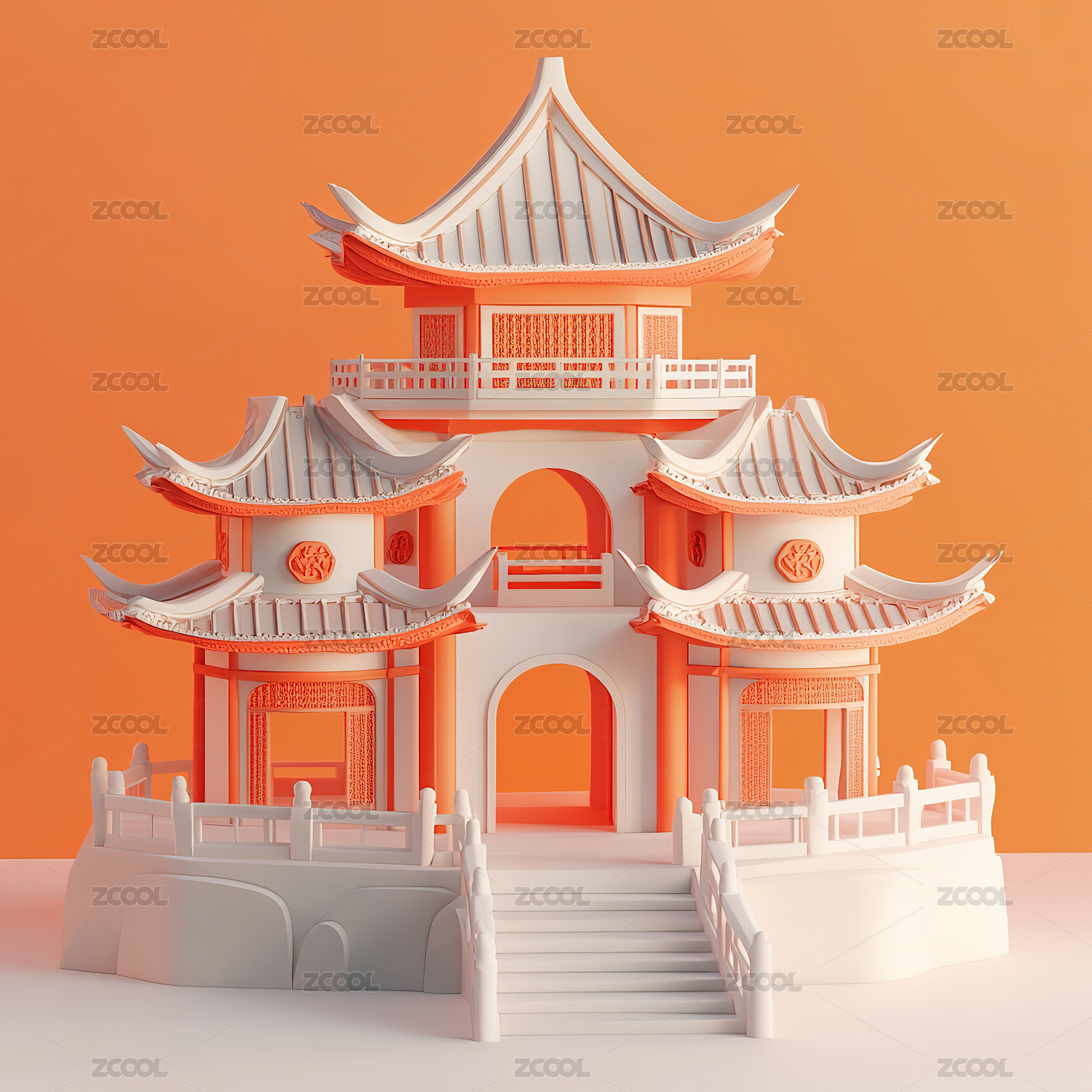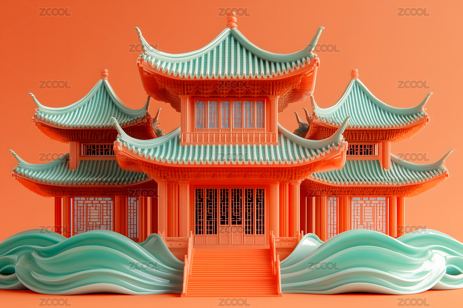 3D渲染中国风古建筑琉璃材质中式阁楼元素