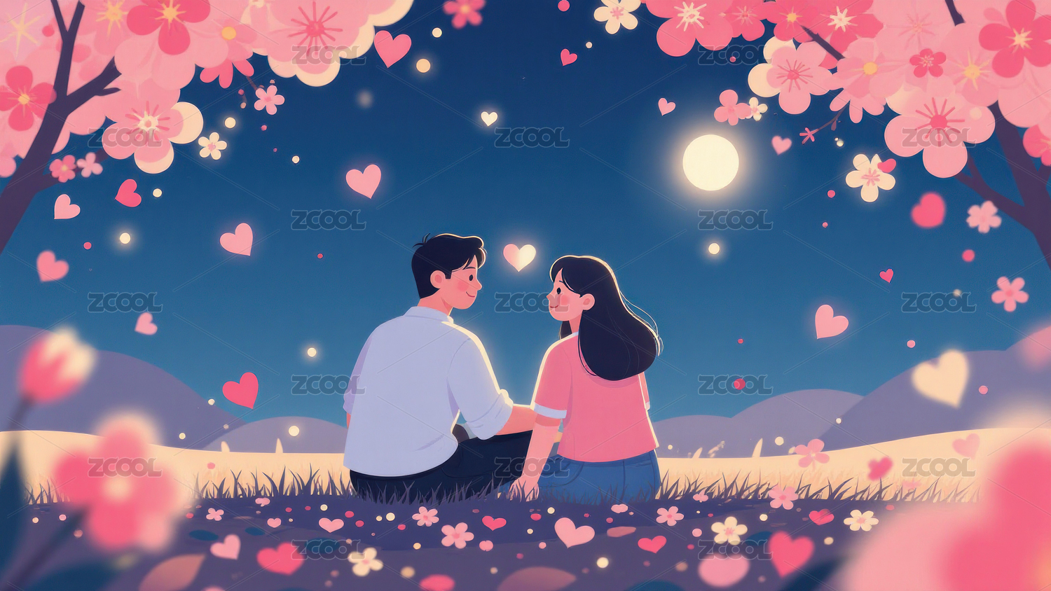 樱花树下的浪漫相遇情人节夜晚情侣约会