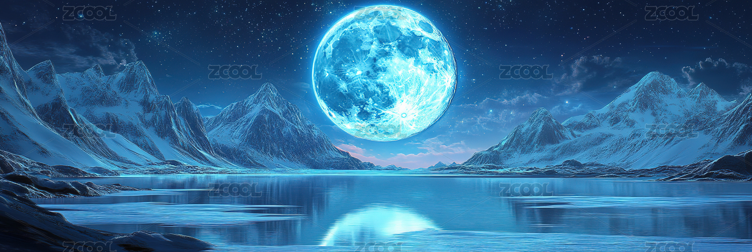 淡蓝满月下的雪山景观