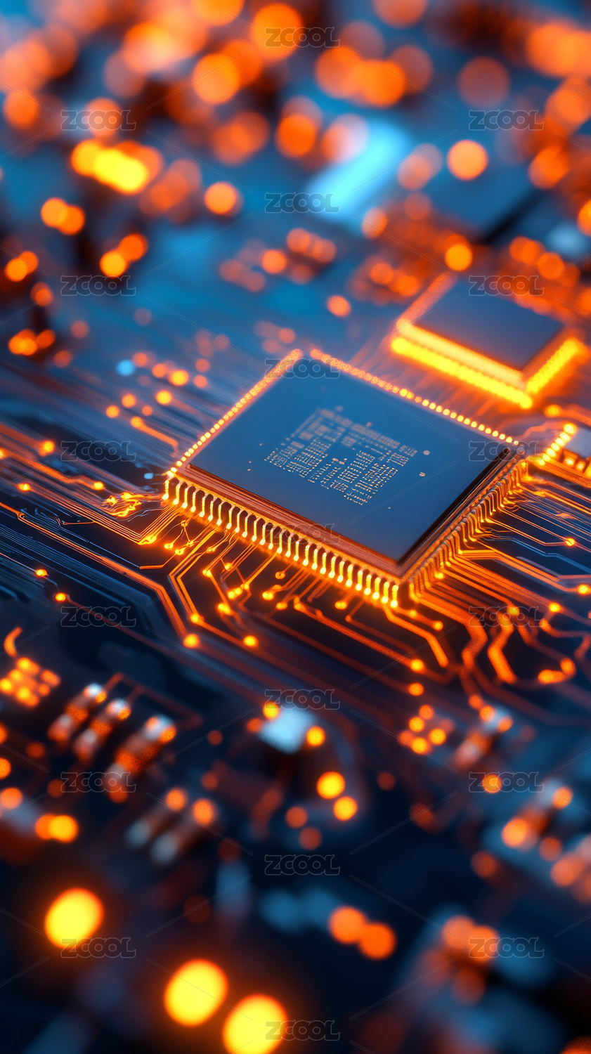 深蓝色与橙色电子芯片细节