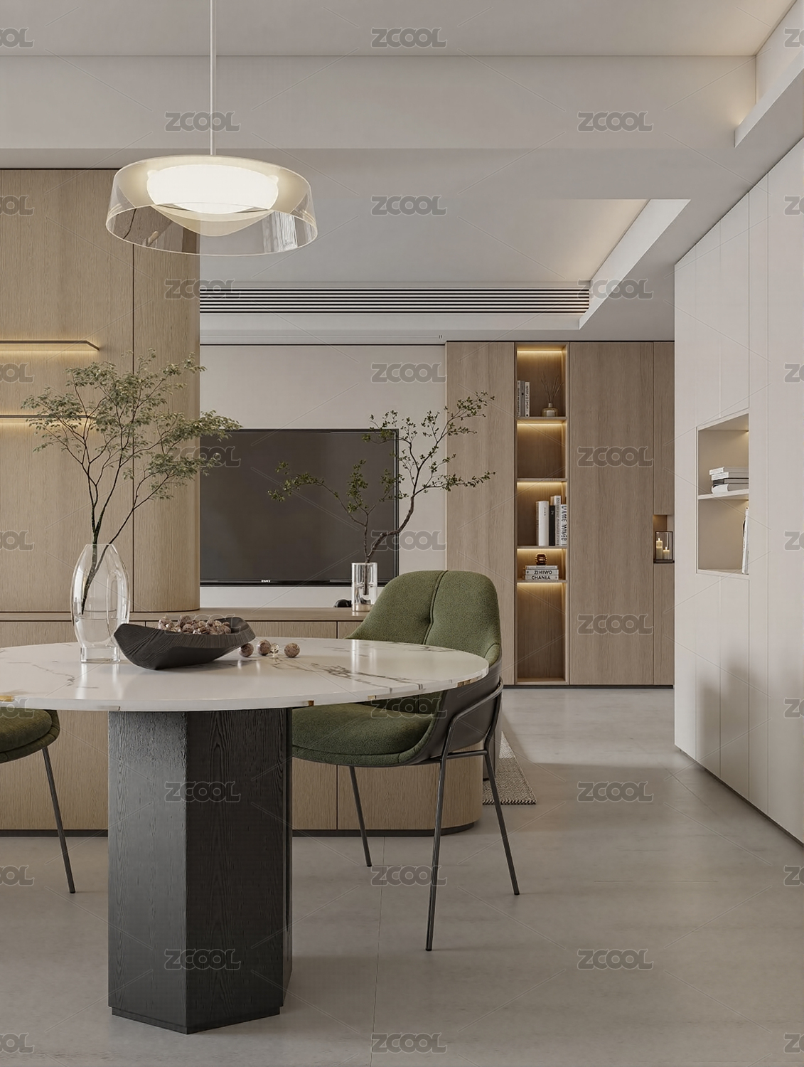 绿色,墙壁,吊灯,圆形,餐桌,椅子,画作,窗户,现代,简约