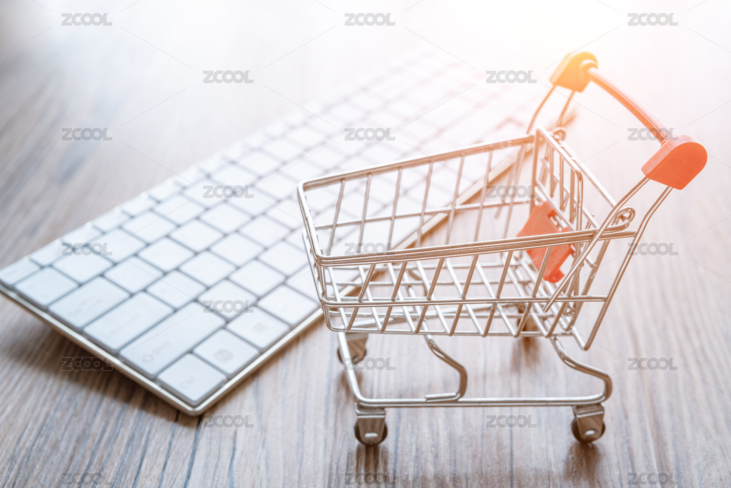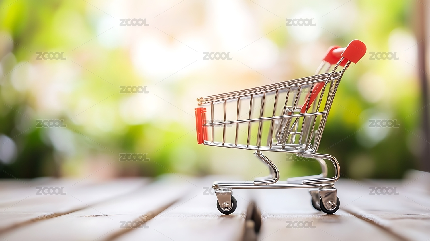 放在办公桌上的财务数据报表和装着硬币的购物车