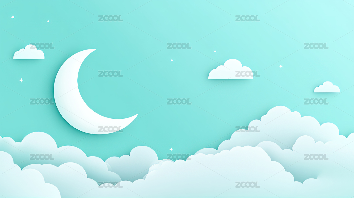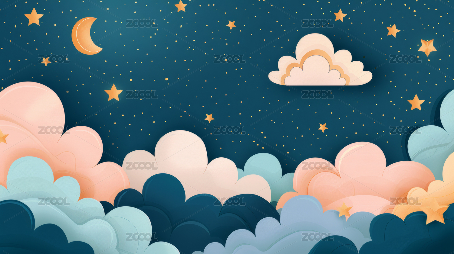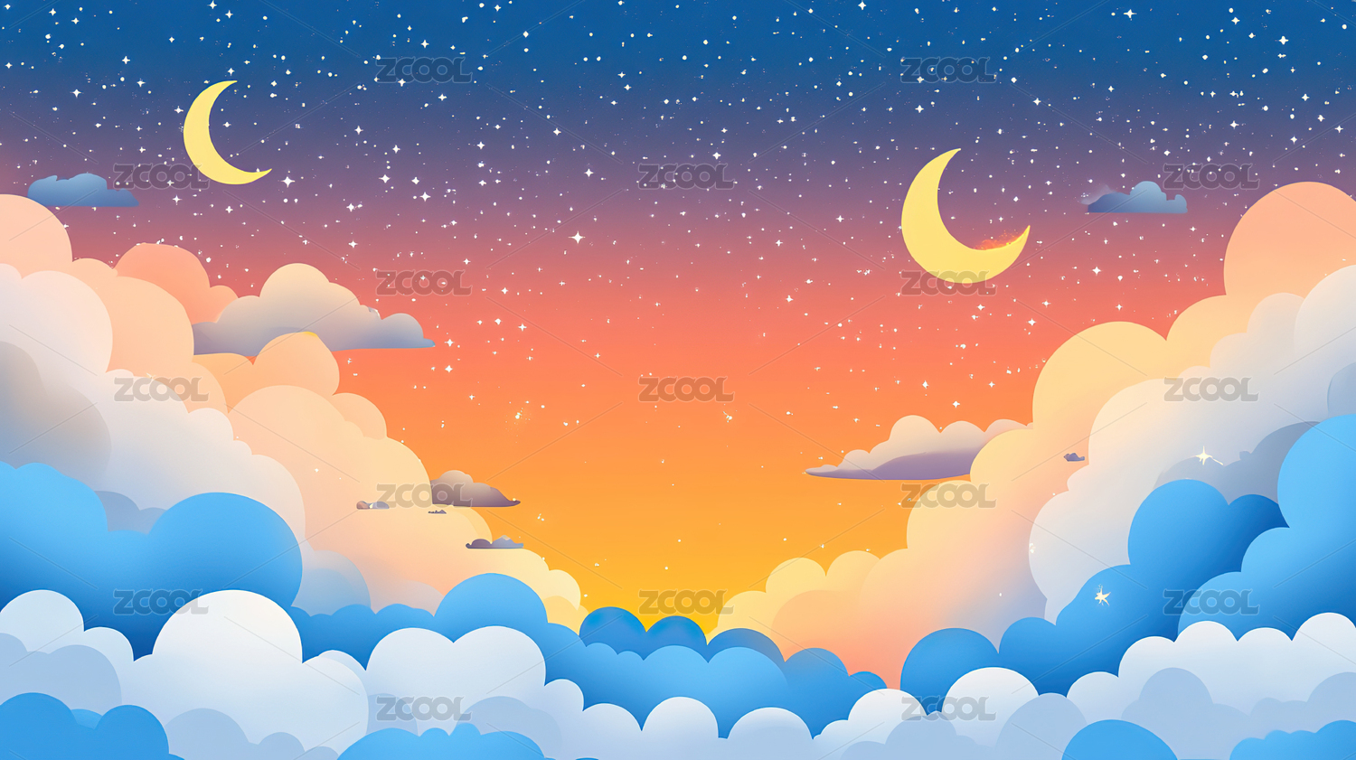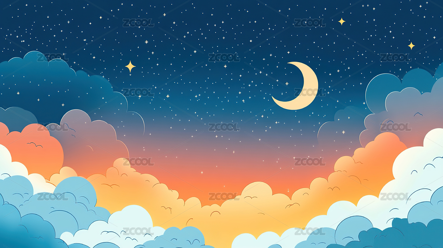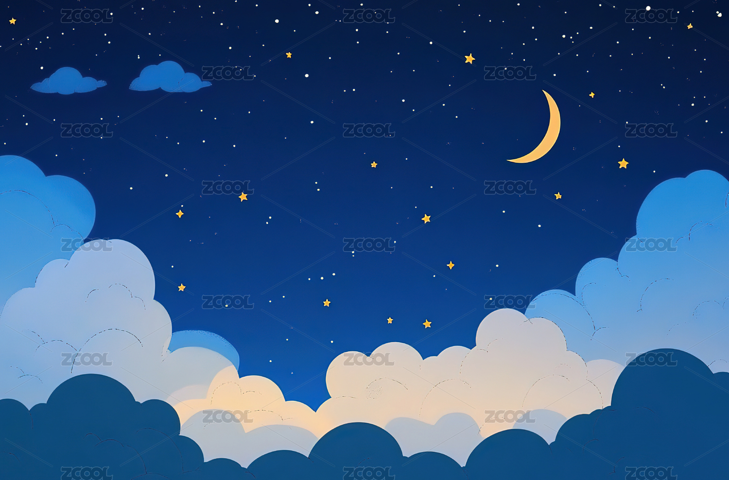 夜空中的星星、月亮和云朵,可爱漫画背景
