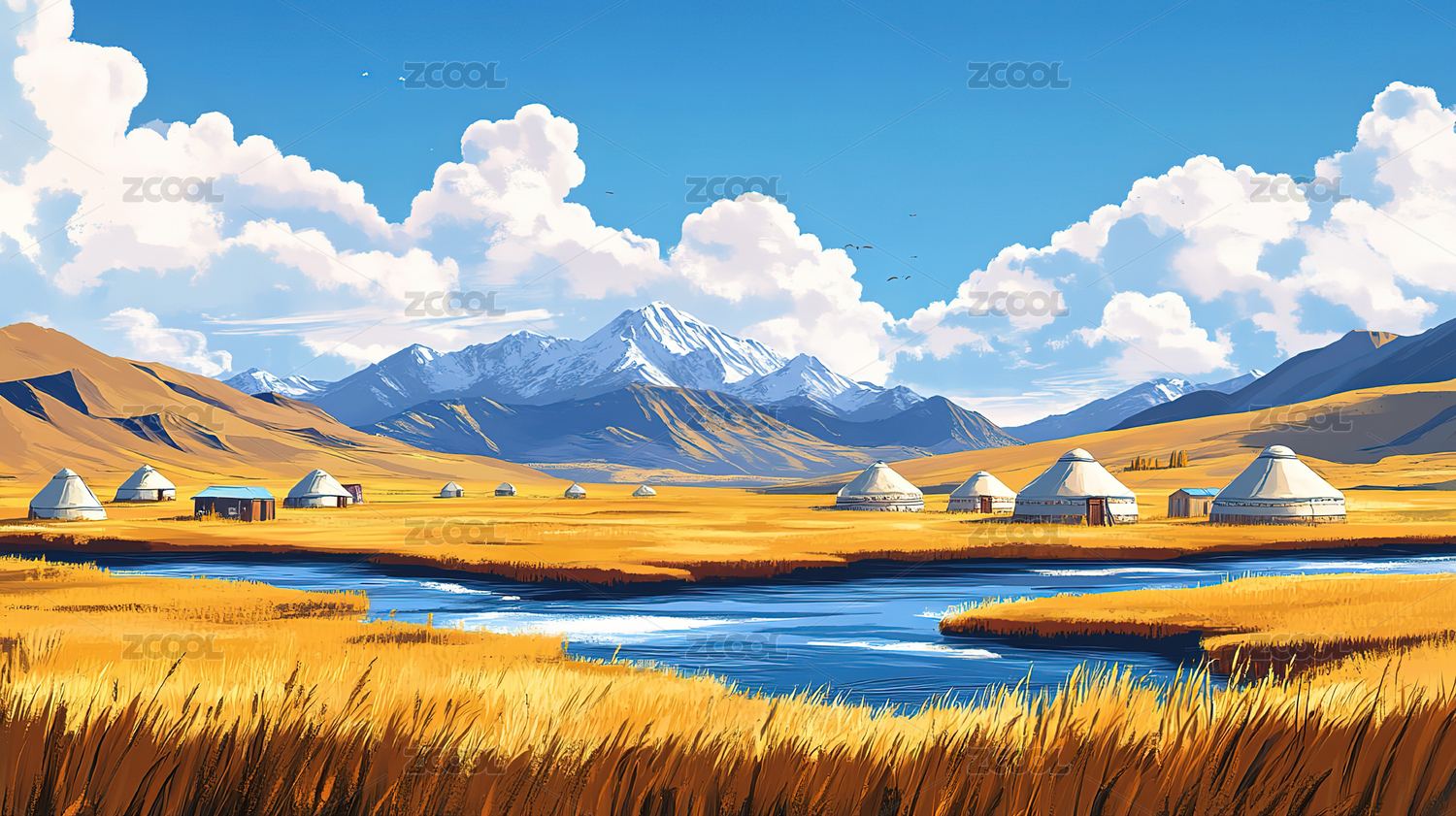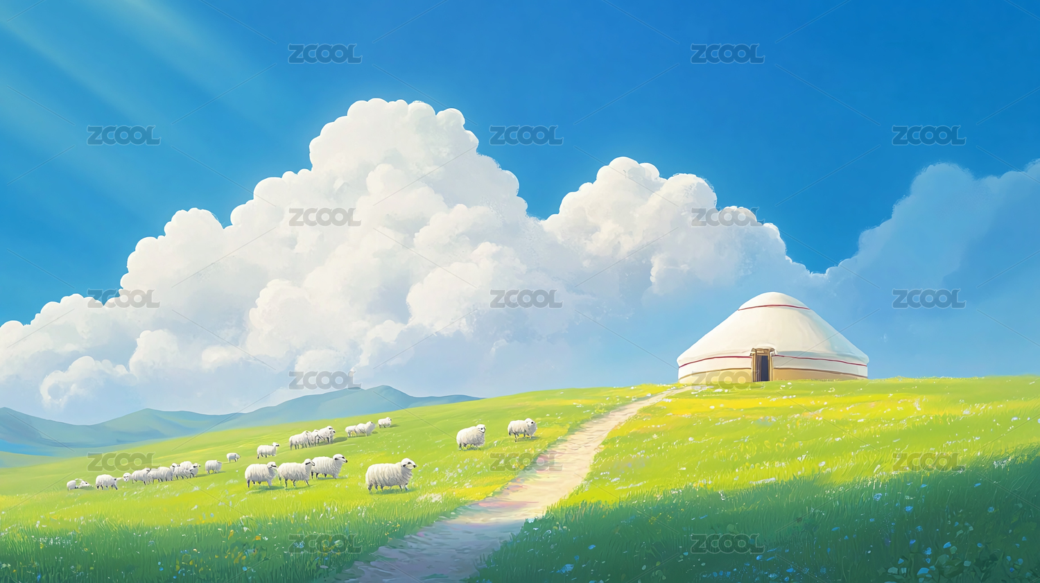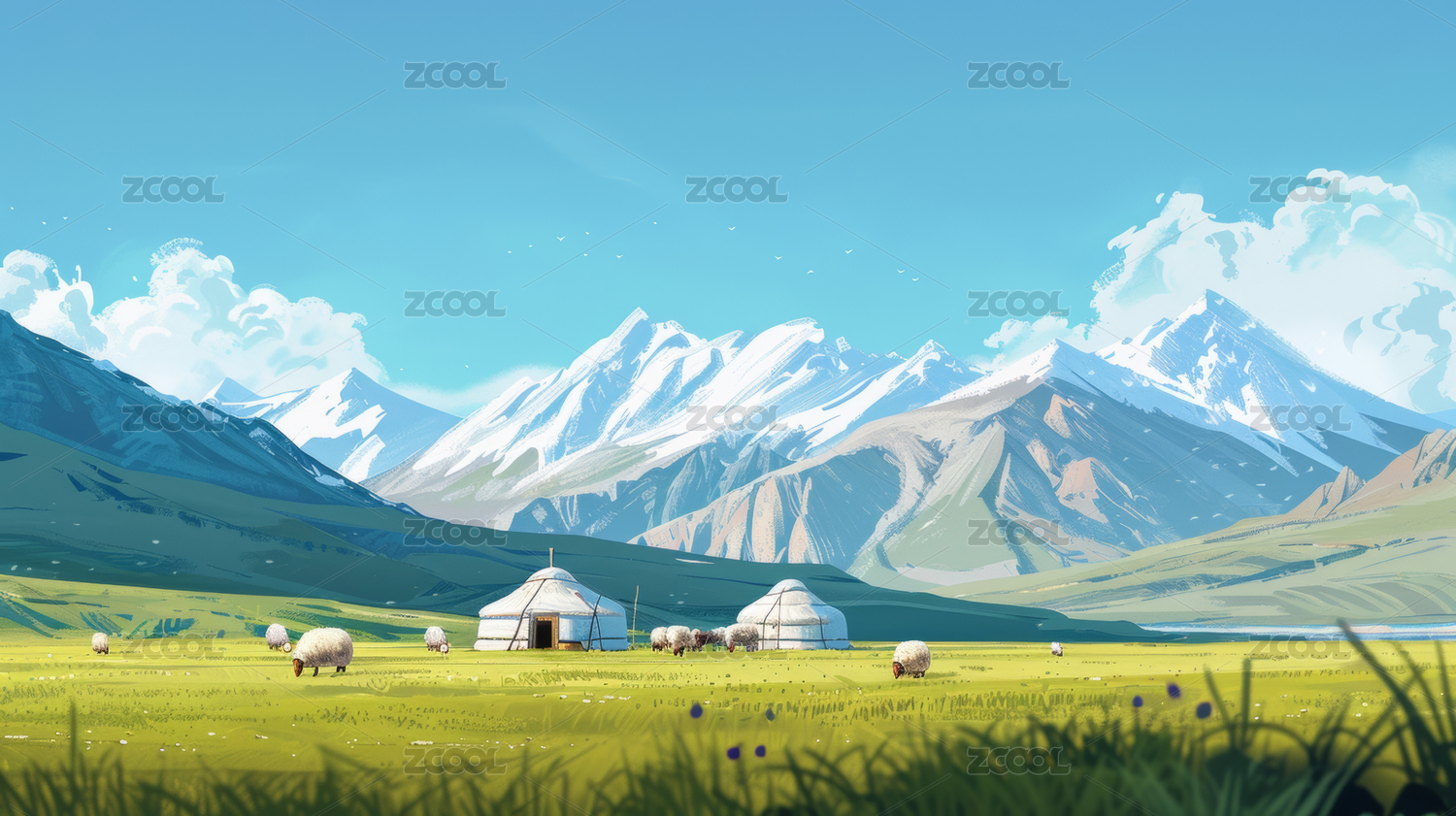 蓝天白云、雪山草原和蒙古包羊群,风景插画