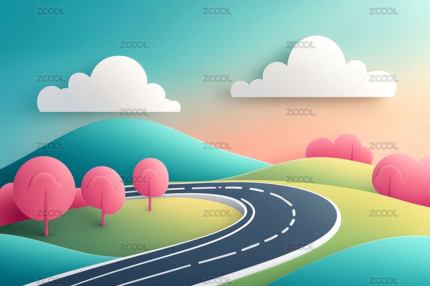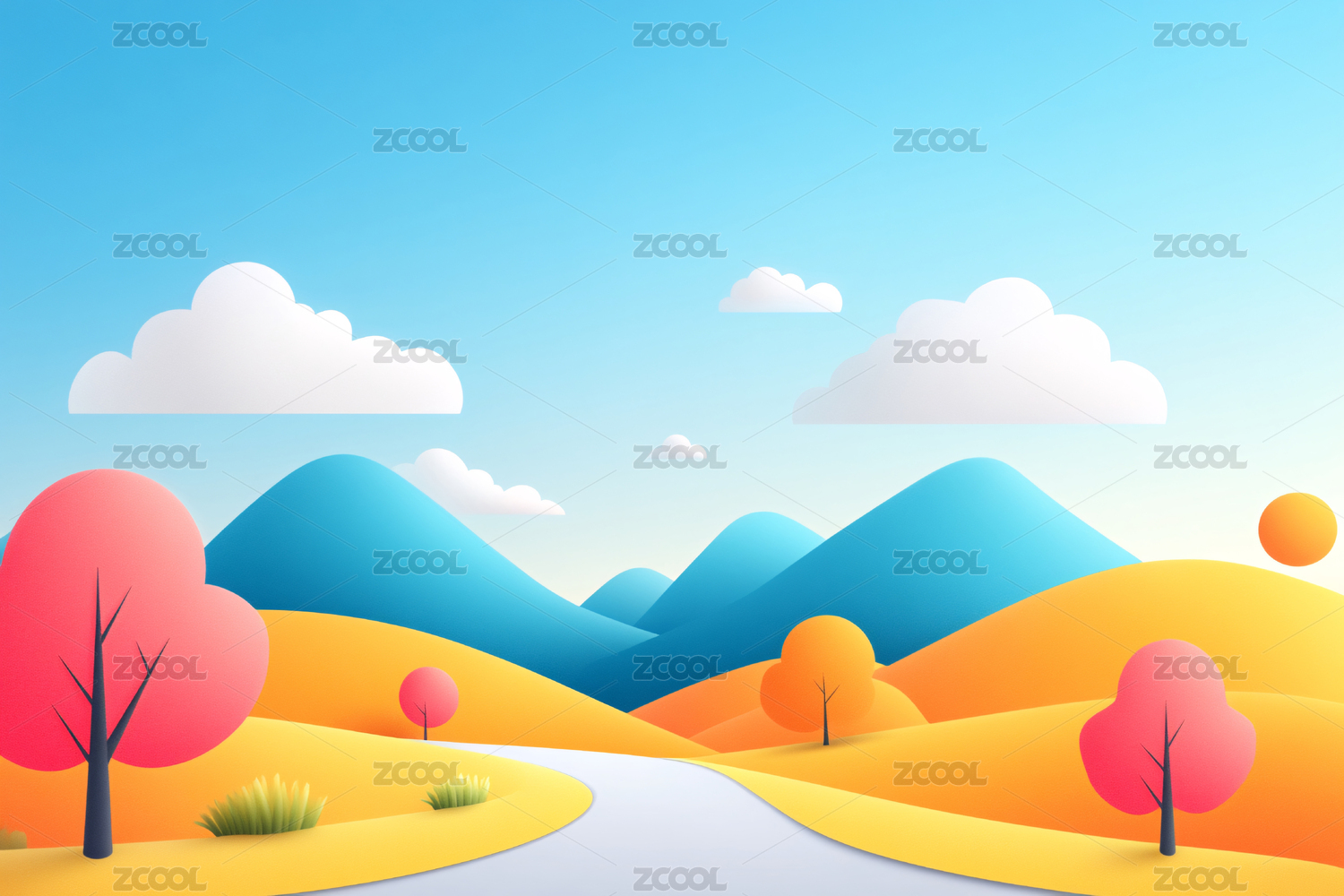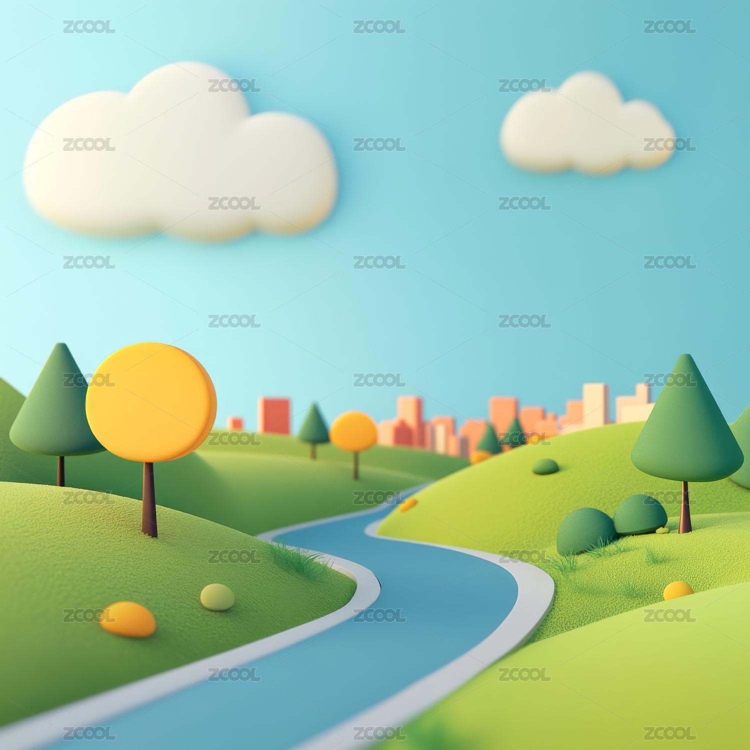 卡通风格的田园风光与蜿蜒小路