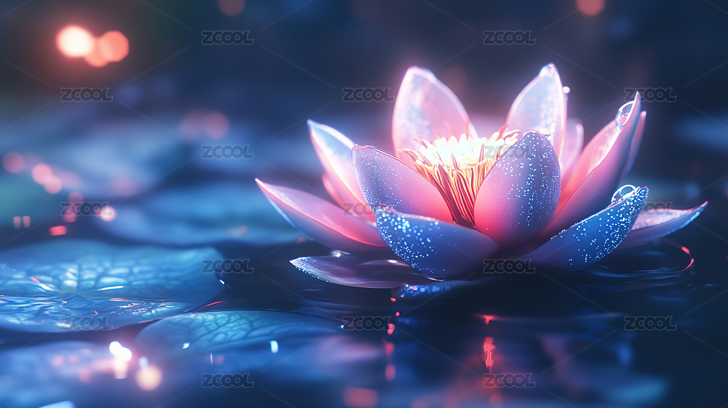魔法发光睡莲在水塘中美丽盛开的特写插图