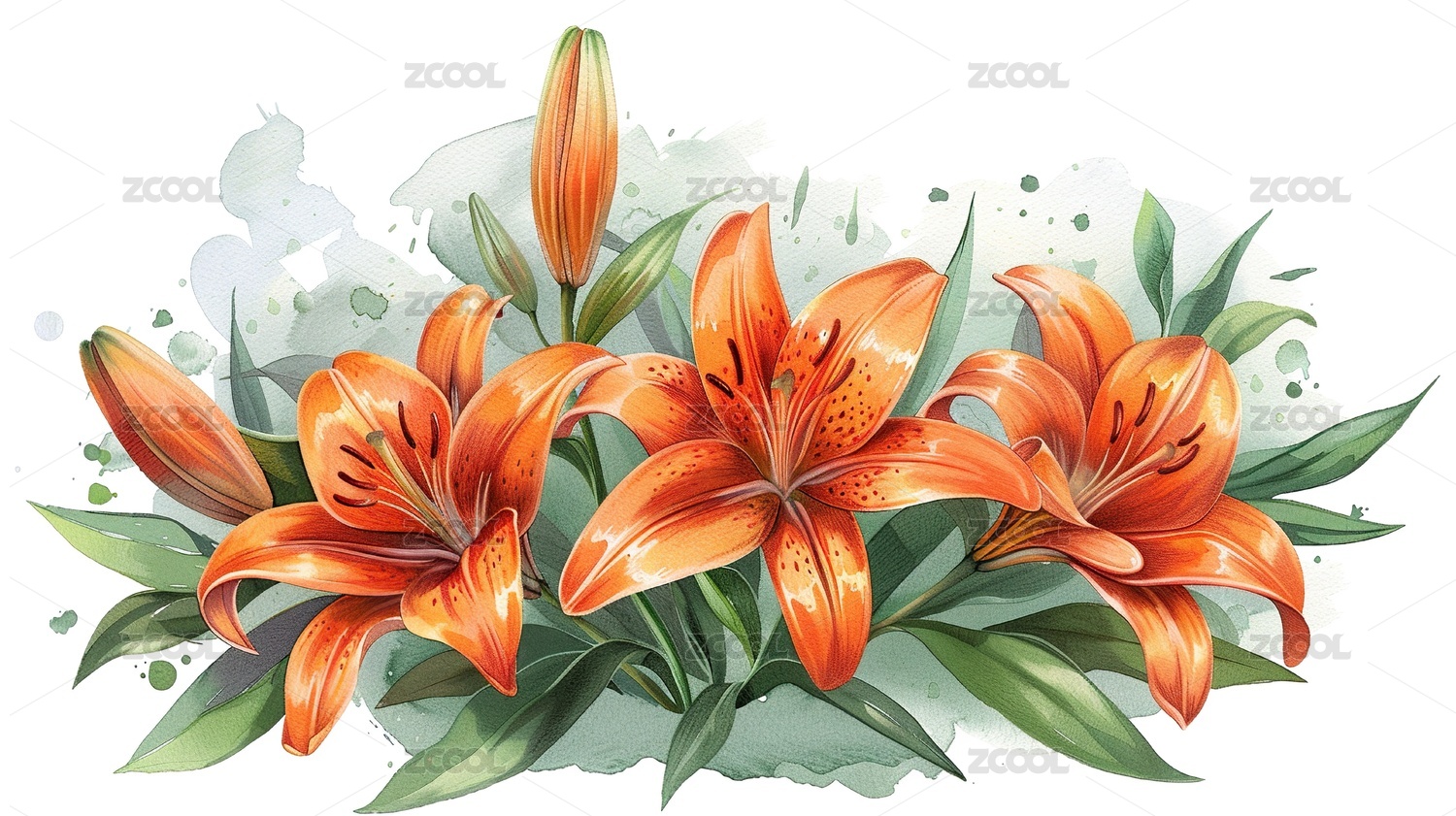 水彩,画风,橙色,百合,花朵,优雅,绽放,自然,之美,花瓣