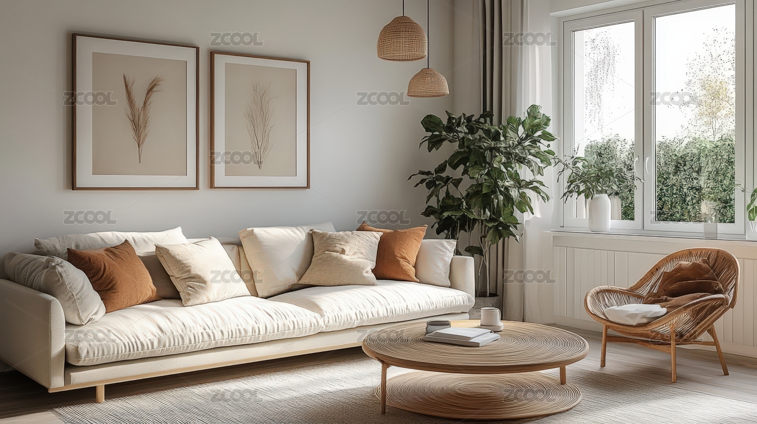 粗麻布家居沙发地毯等摆设的客厅空场景