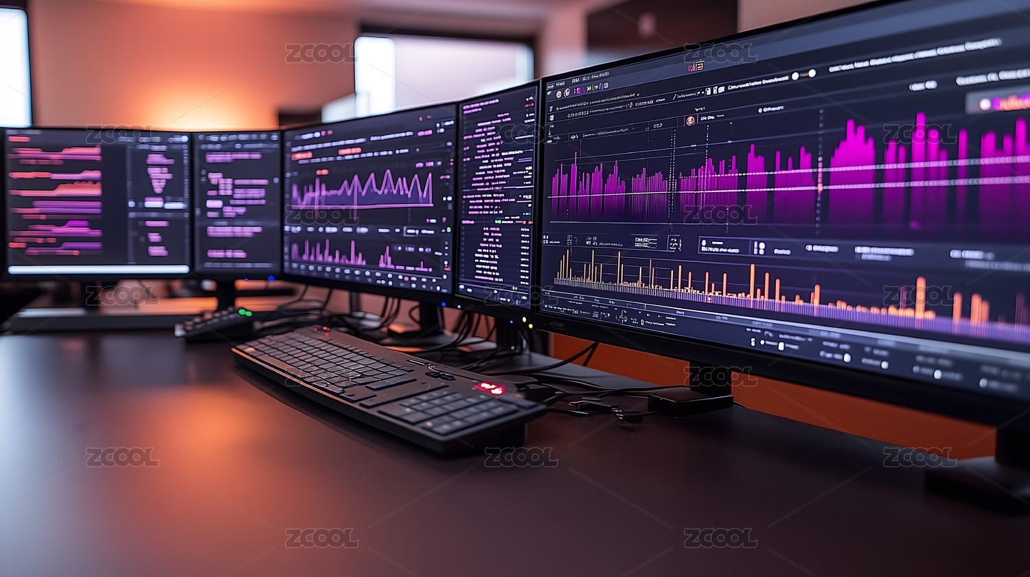 多屏,显示器,交易,图表,工作站,键盘,鼠标,植物,室内,科技