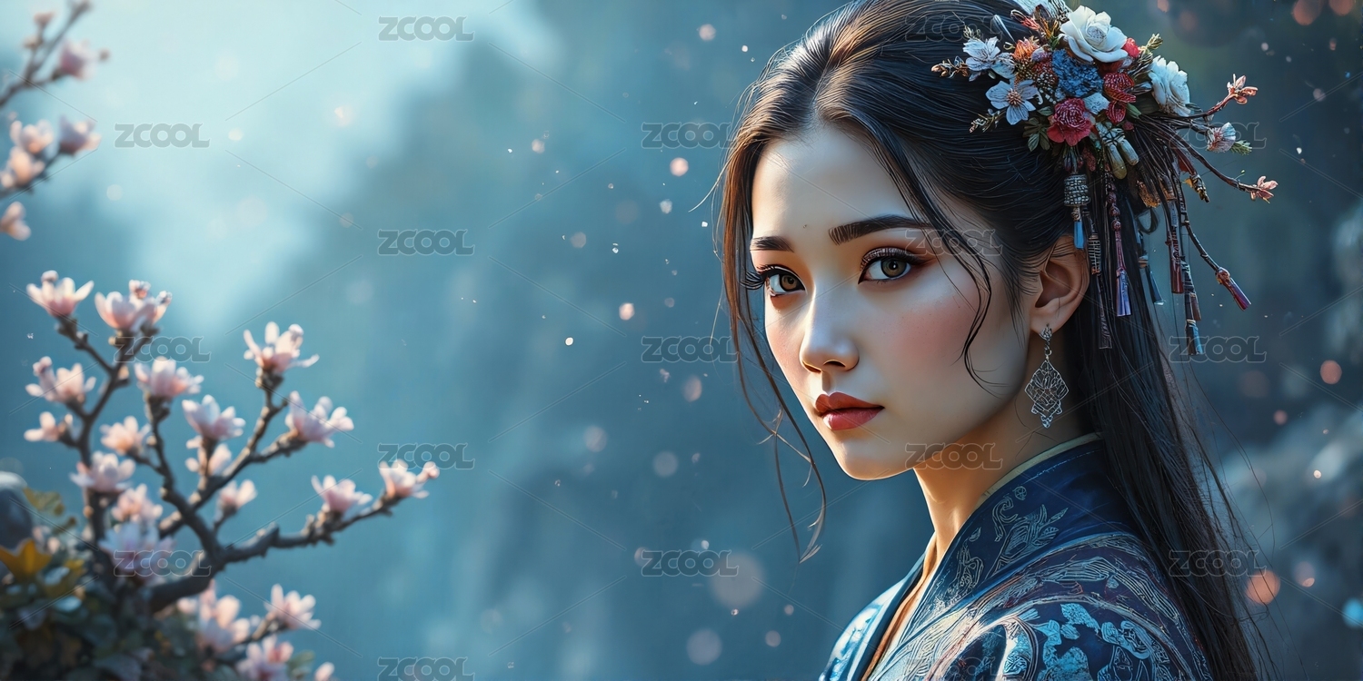 身穿红色和服的年轻亚洲女性在花卉背景前