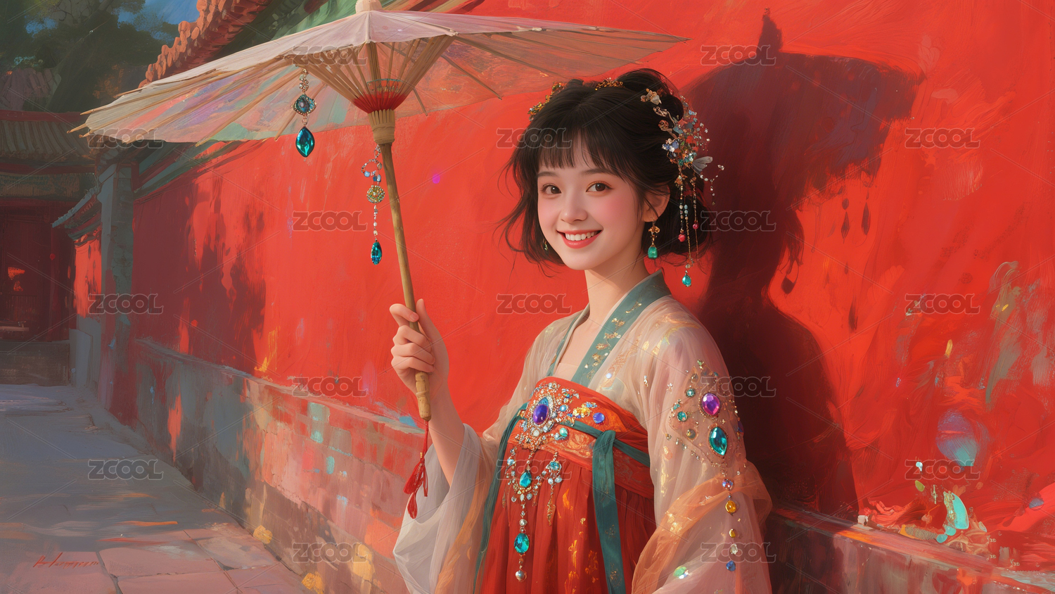 身穿和服撑着红色油纸伞的美丽日本女性肖像