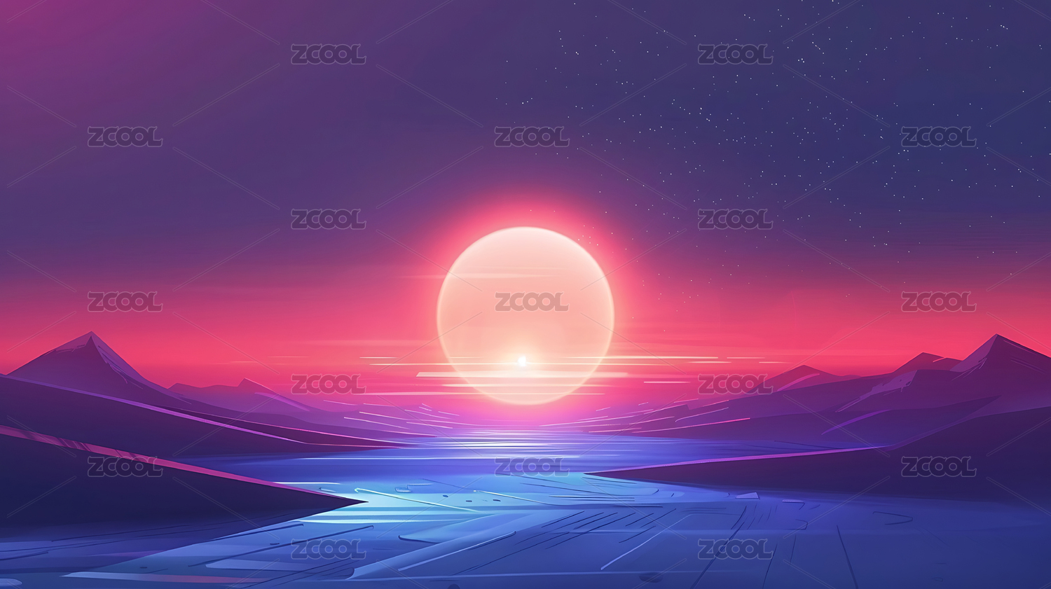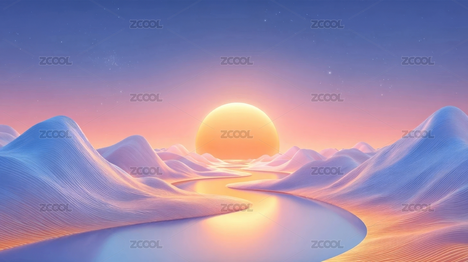 早晨初升的太阳照耀群山峡谷河流插画绘画