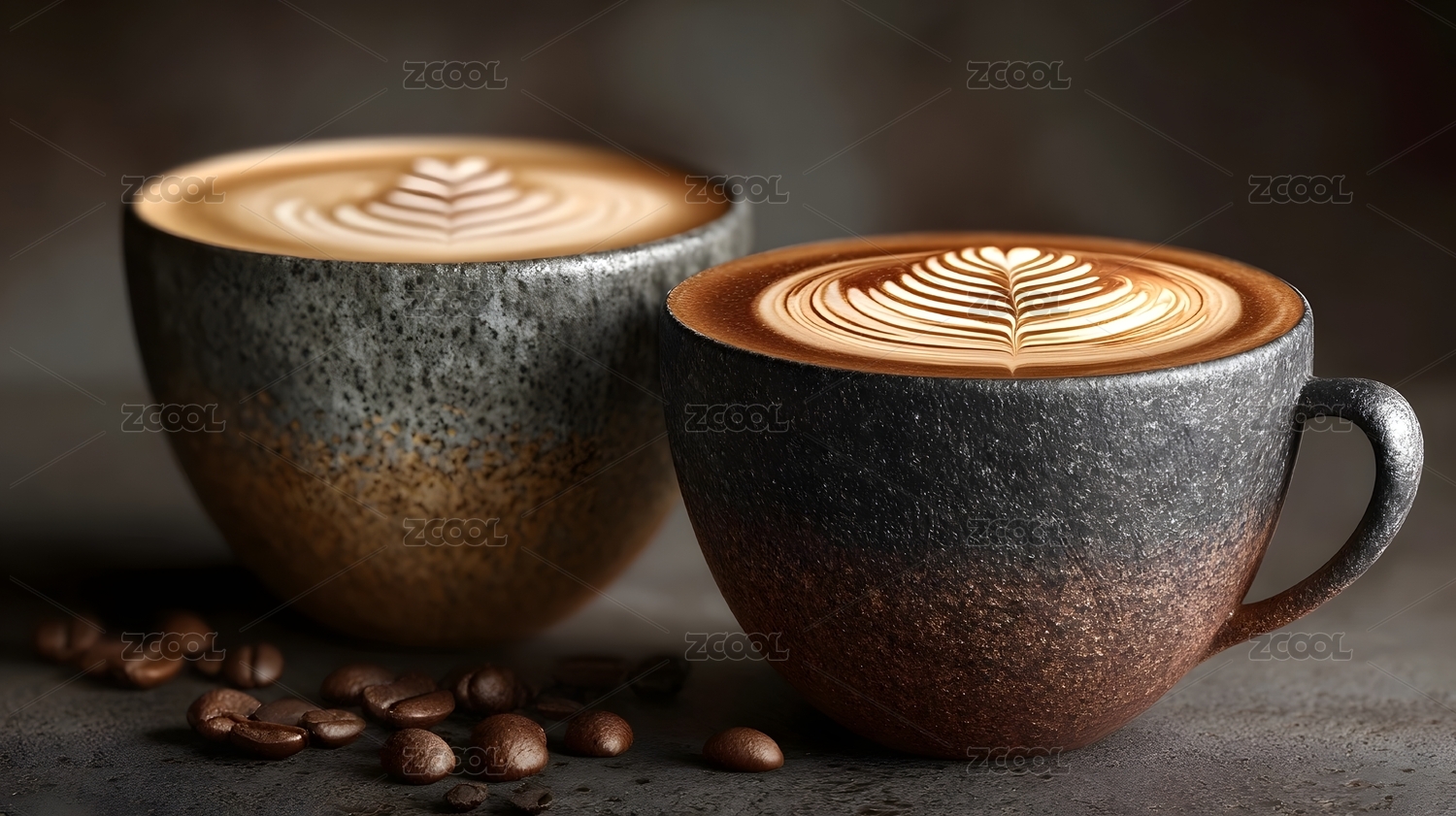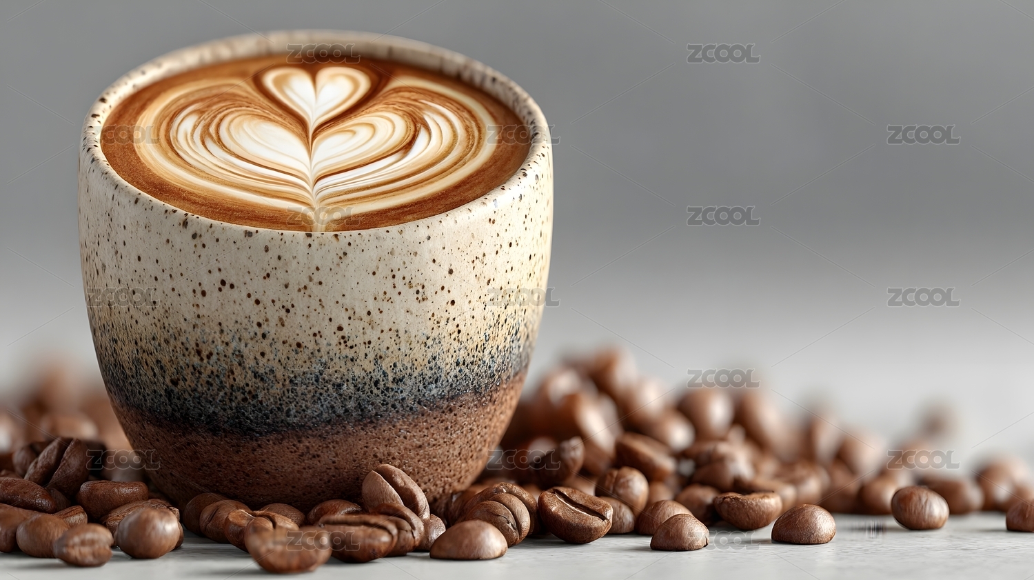 桌面上一杯拿铁咖啡和散落的咖啡豆