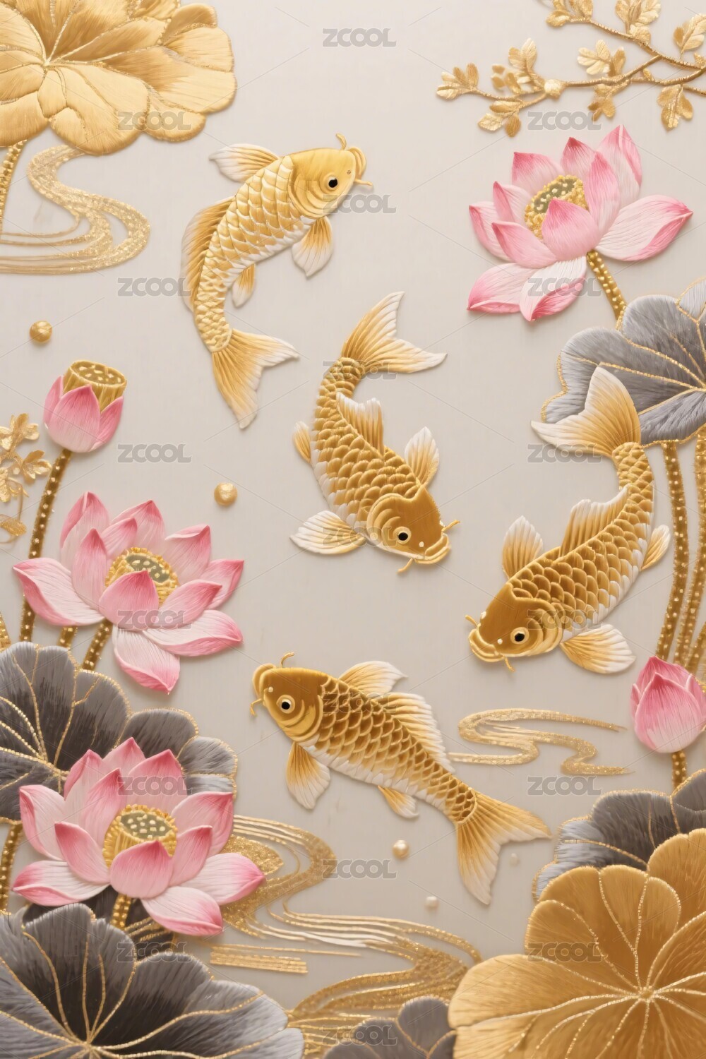 三维立体,3D,创意,中国风,鲤鱼,莲花,金色,祥瑞,鱼,金鱼