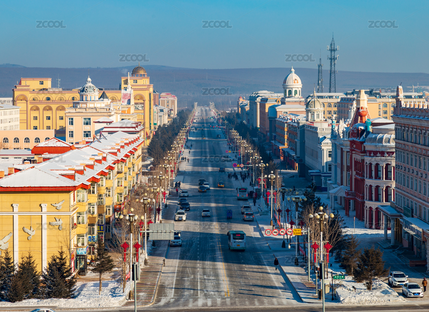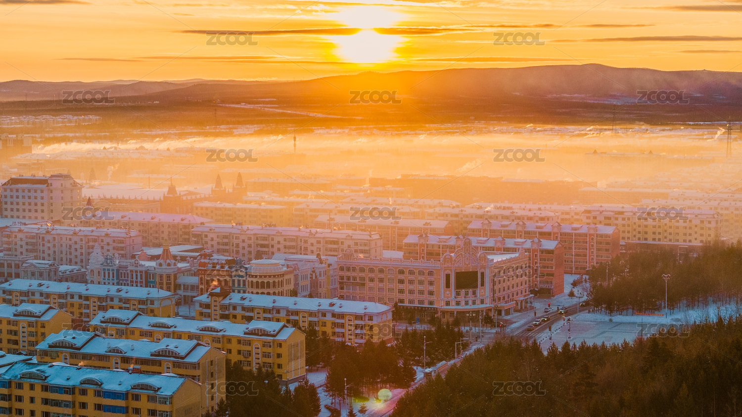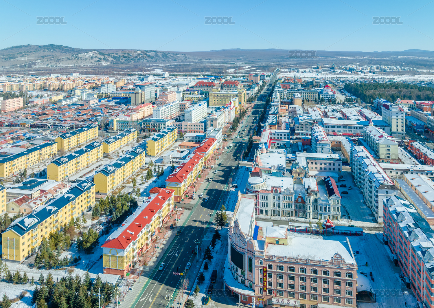 冬天中国呼伦贝尔傍晚的额尔古纳市楼房建筑