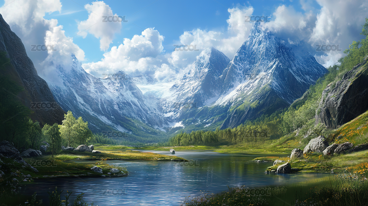 雪山湖泊草原风景画