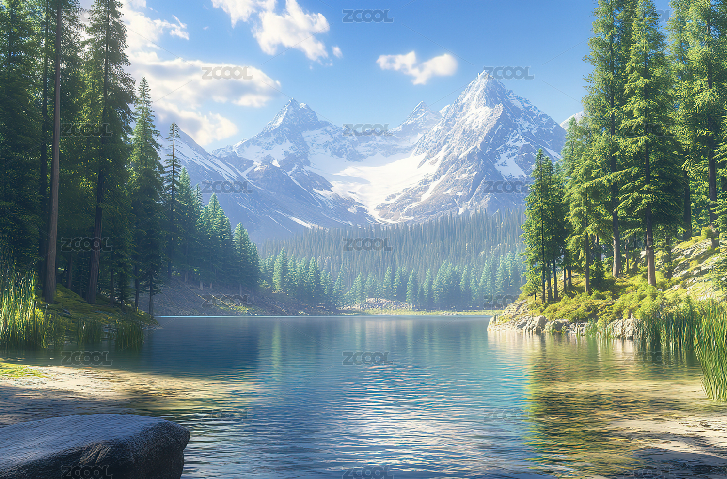 雪山森林和湖泊倒影自然风景插画