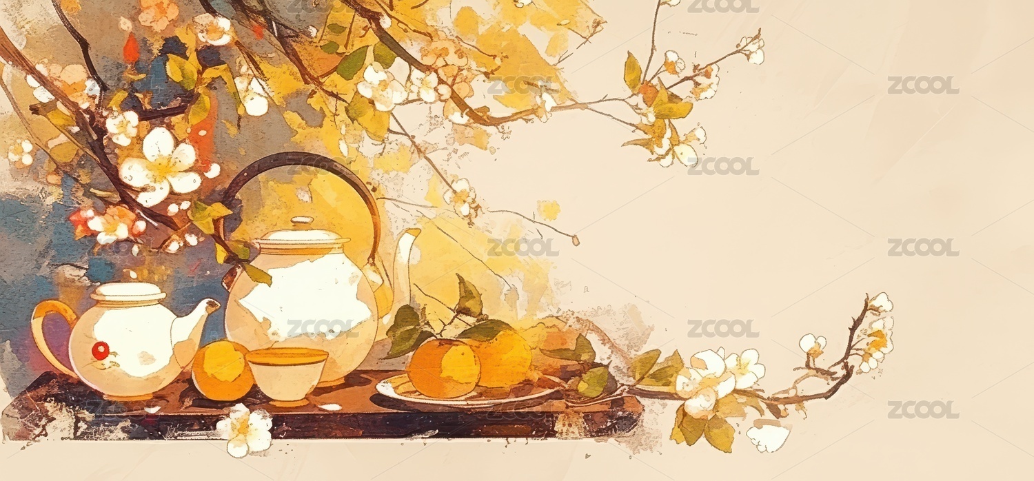 秋日柿子茶饮静物写意图