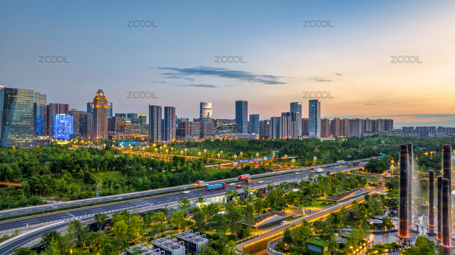 城市日落天空色彩斑斓,高架公路一直通向西方地平线
