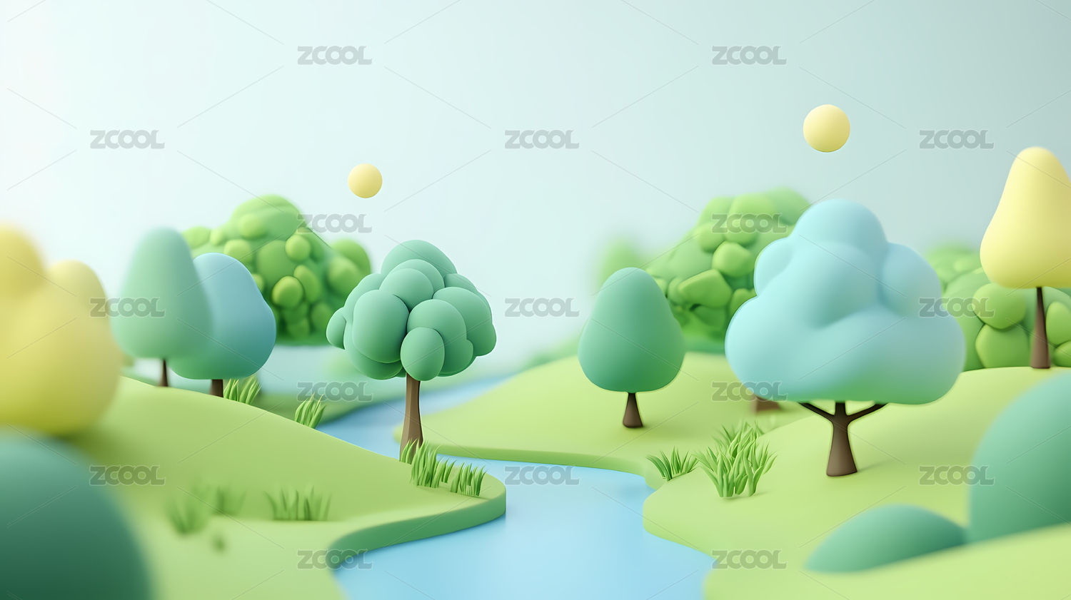 绿色的大堤中间蜿蜒的河流风景3D卡通插画
