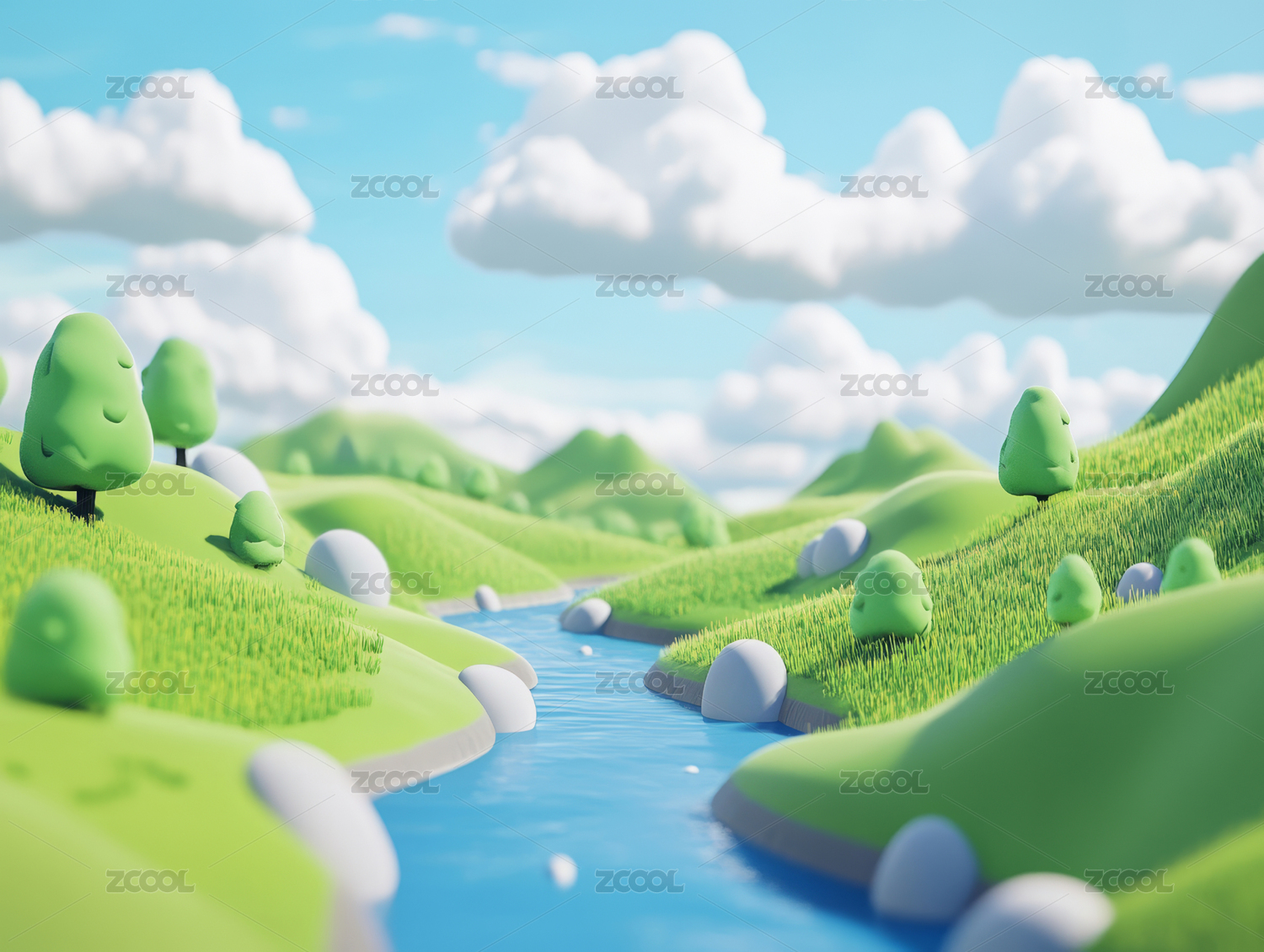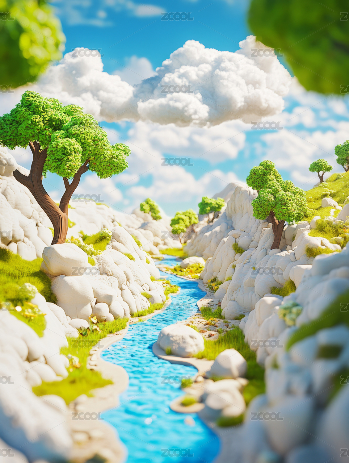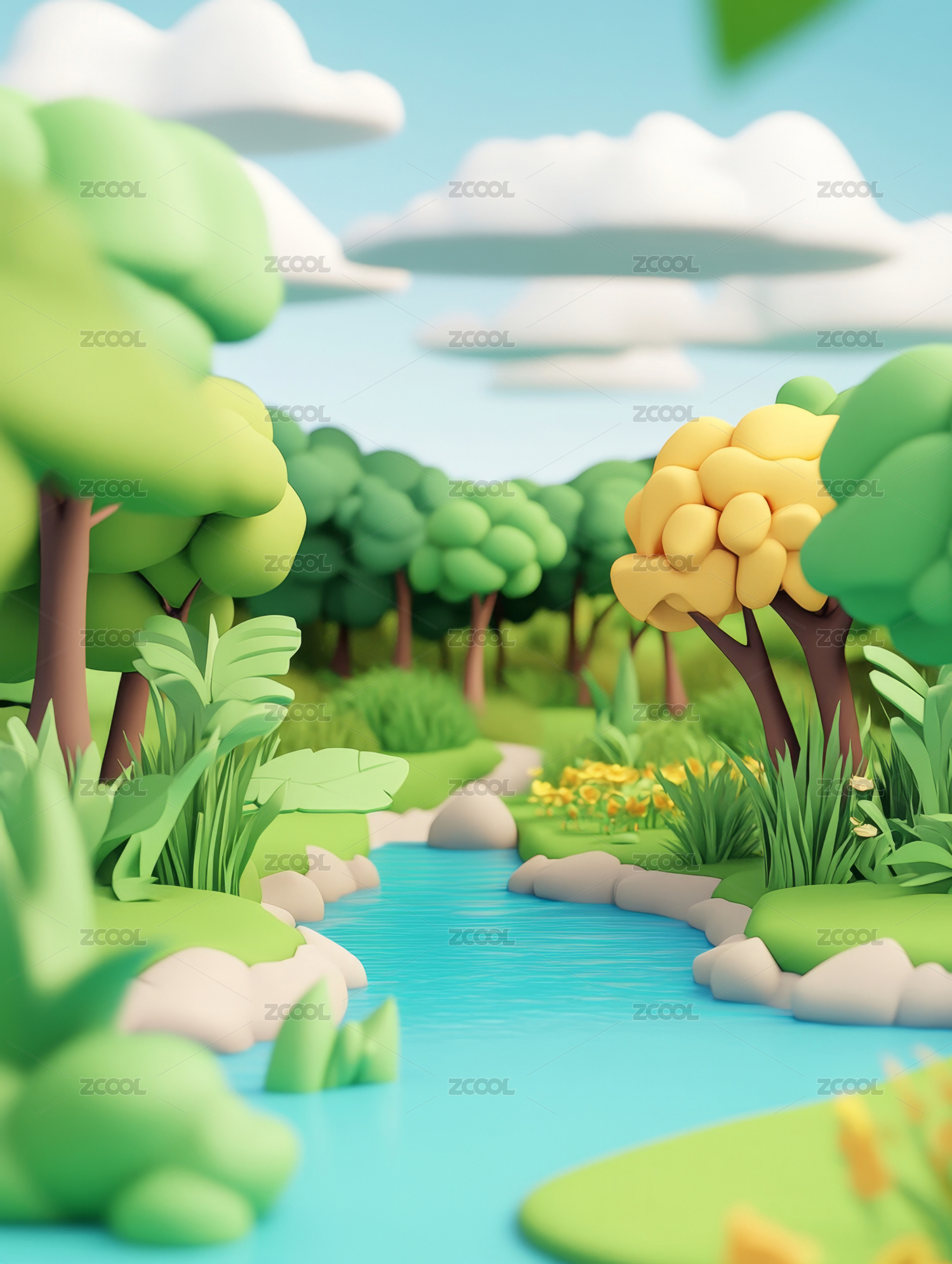 夏天绿色生机的山间小溪3D卡通立体插画