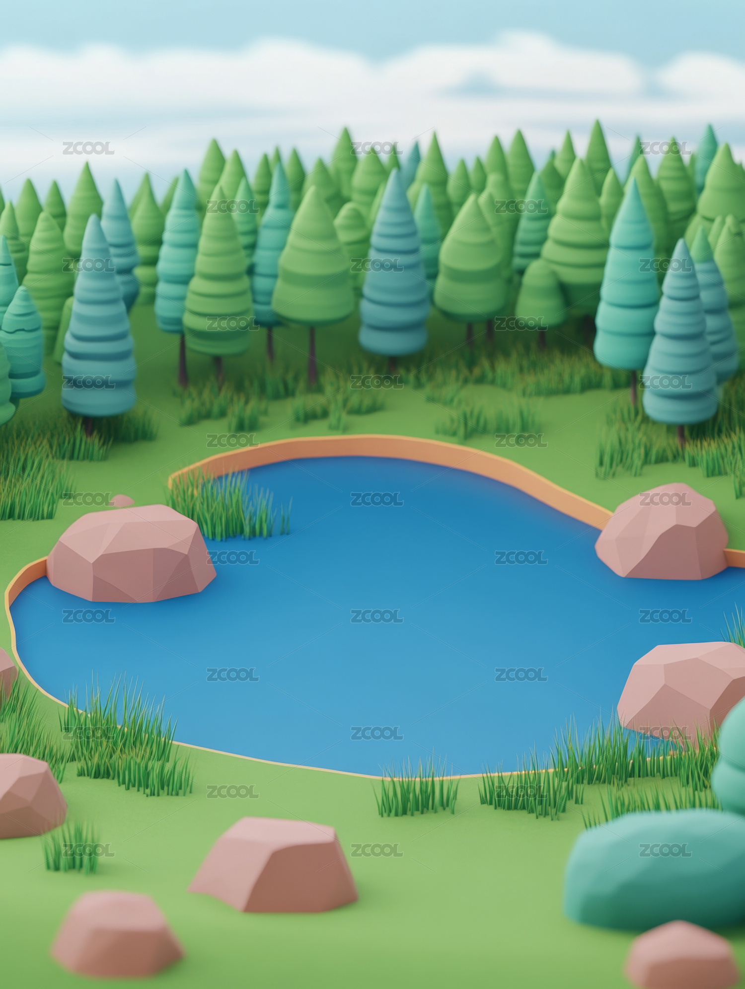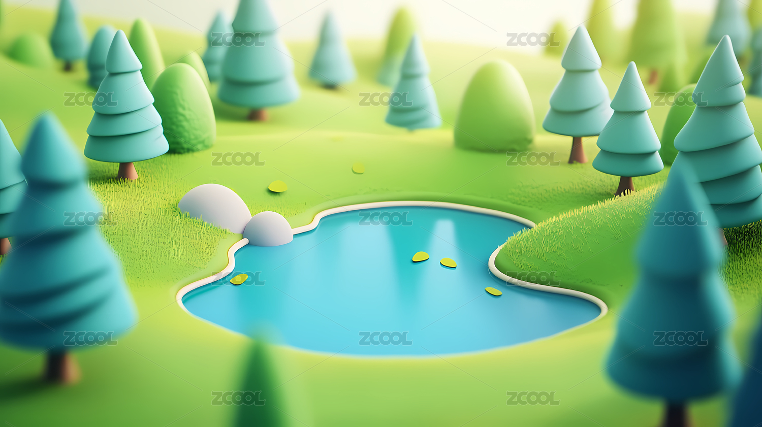 卡通森林中的小池塘