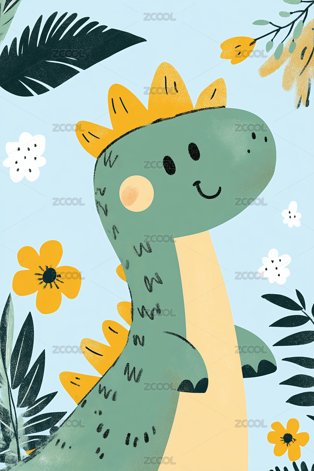 恐龙,植物,卡通,绿色,黄色,叶子,花朵,可爱,微笑