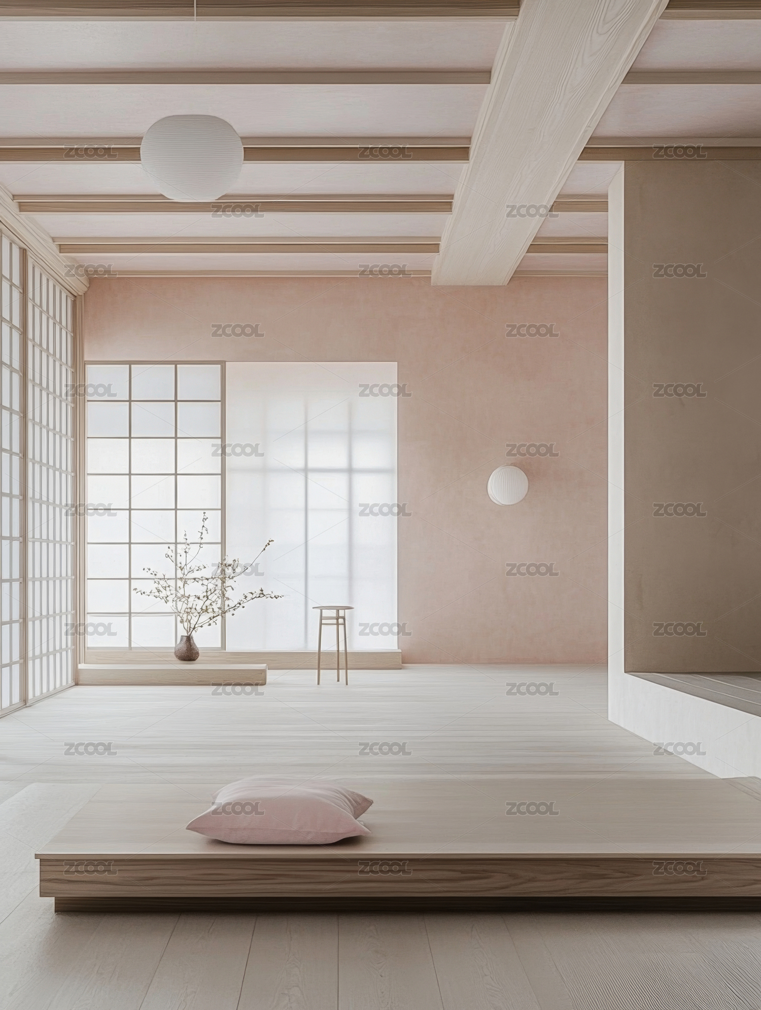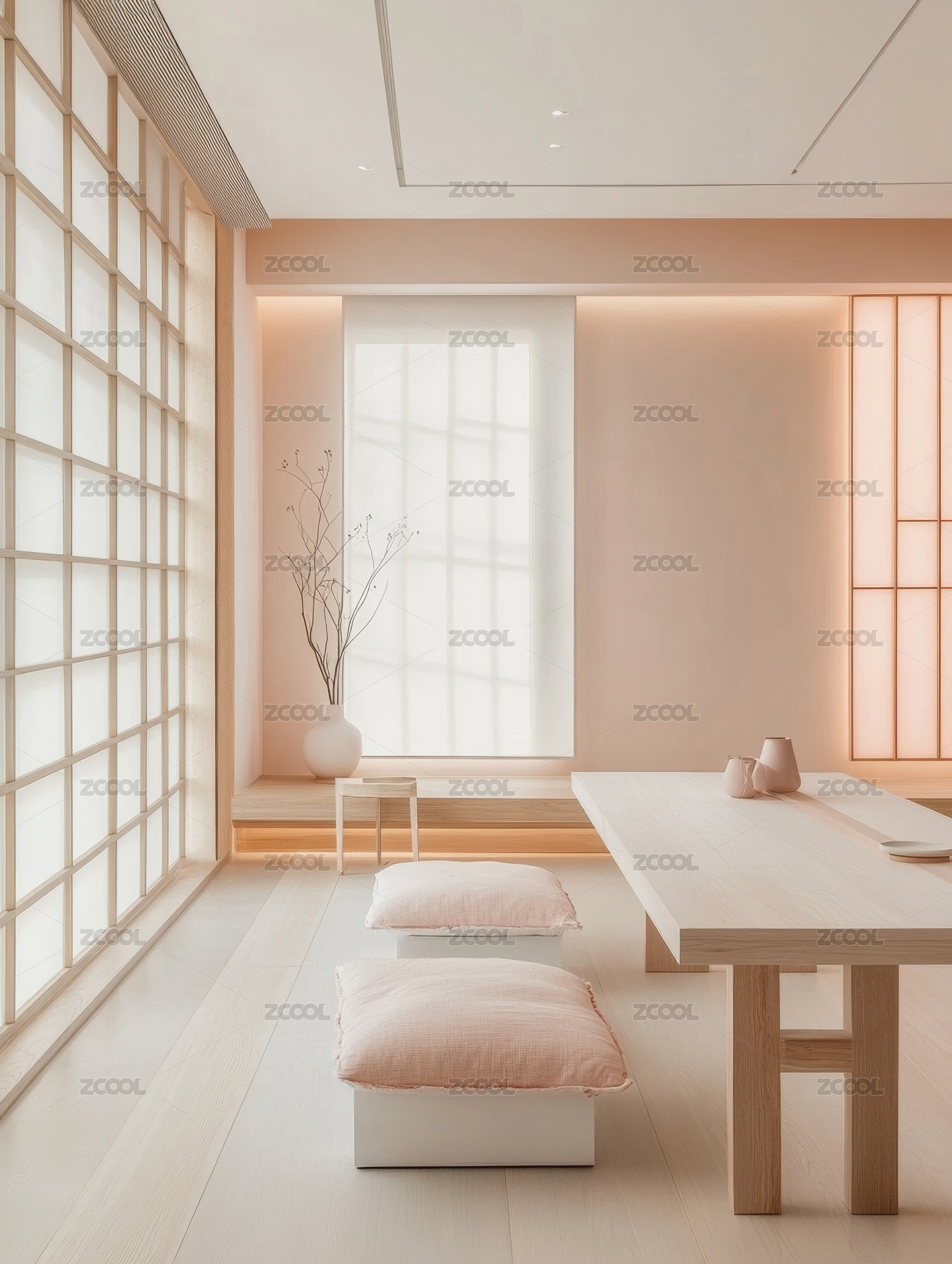 日式,简约,茶室,榻榻米,吊灯,窗户,花瓶,自然光,木质,家具