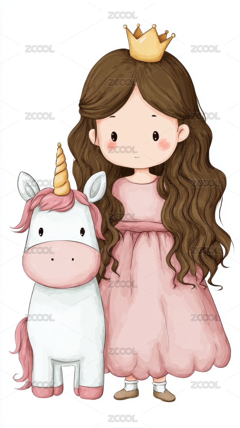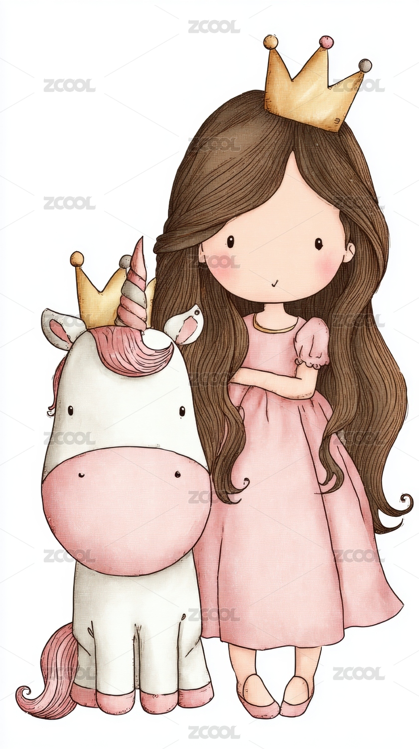 一个戴着王冠的卡通女孩穿着粉色连衣裙站着