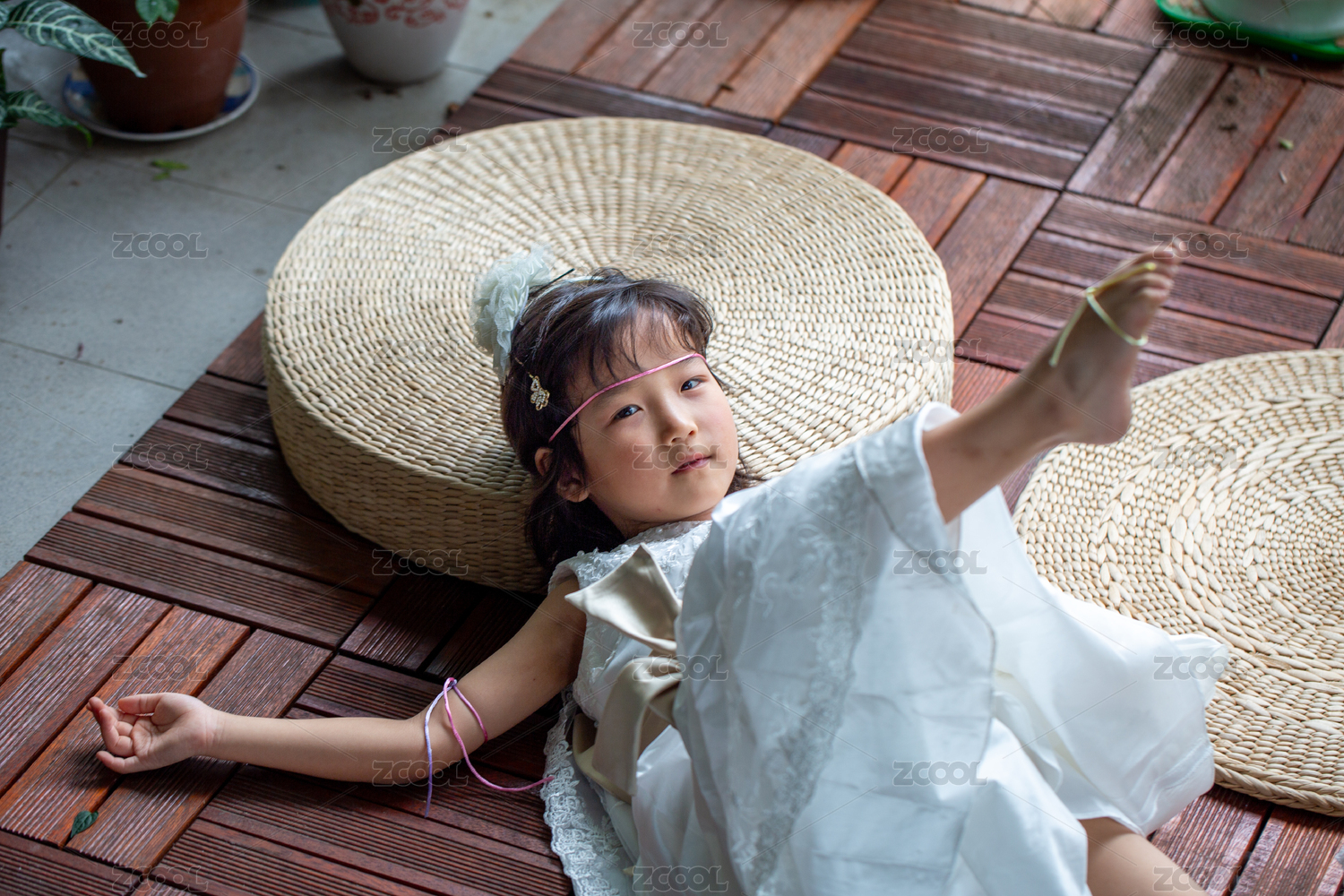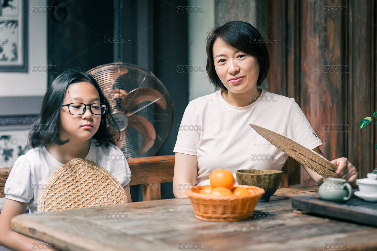 戴眼镜女孩,手持扇子,赏荷,荷叶,古建筑,庭院,中式风格,休闲时刻,生活场景,自然