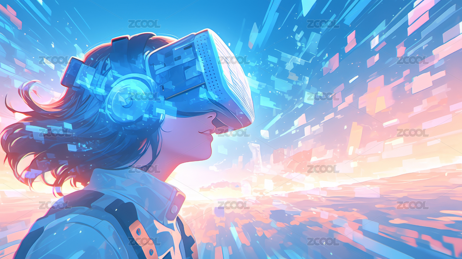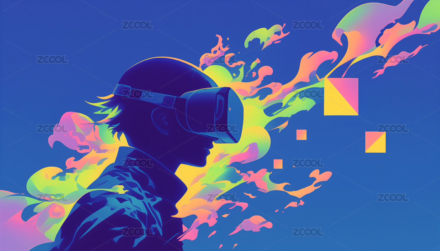 戴着VR眼镜的男性炫彩烟雾方块插画