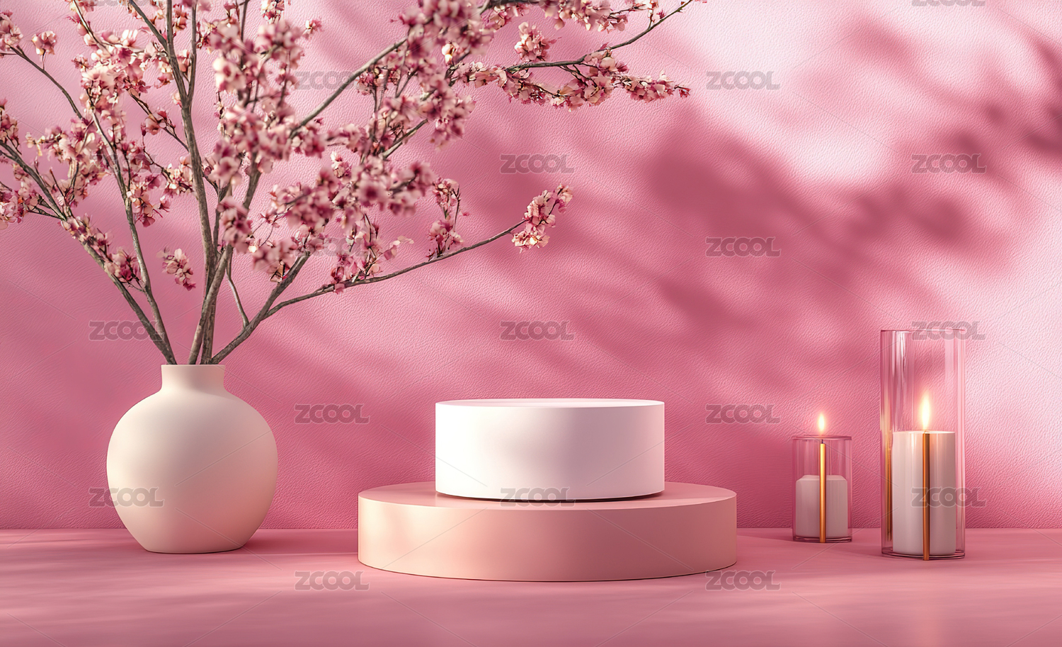 金台,蜡烛,樱花,枝条,花瓣,台面,米色,背景,光影,暖调