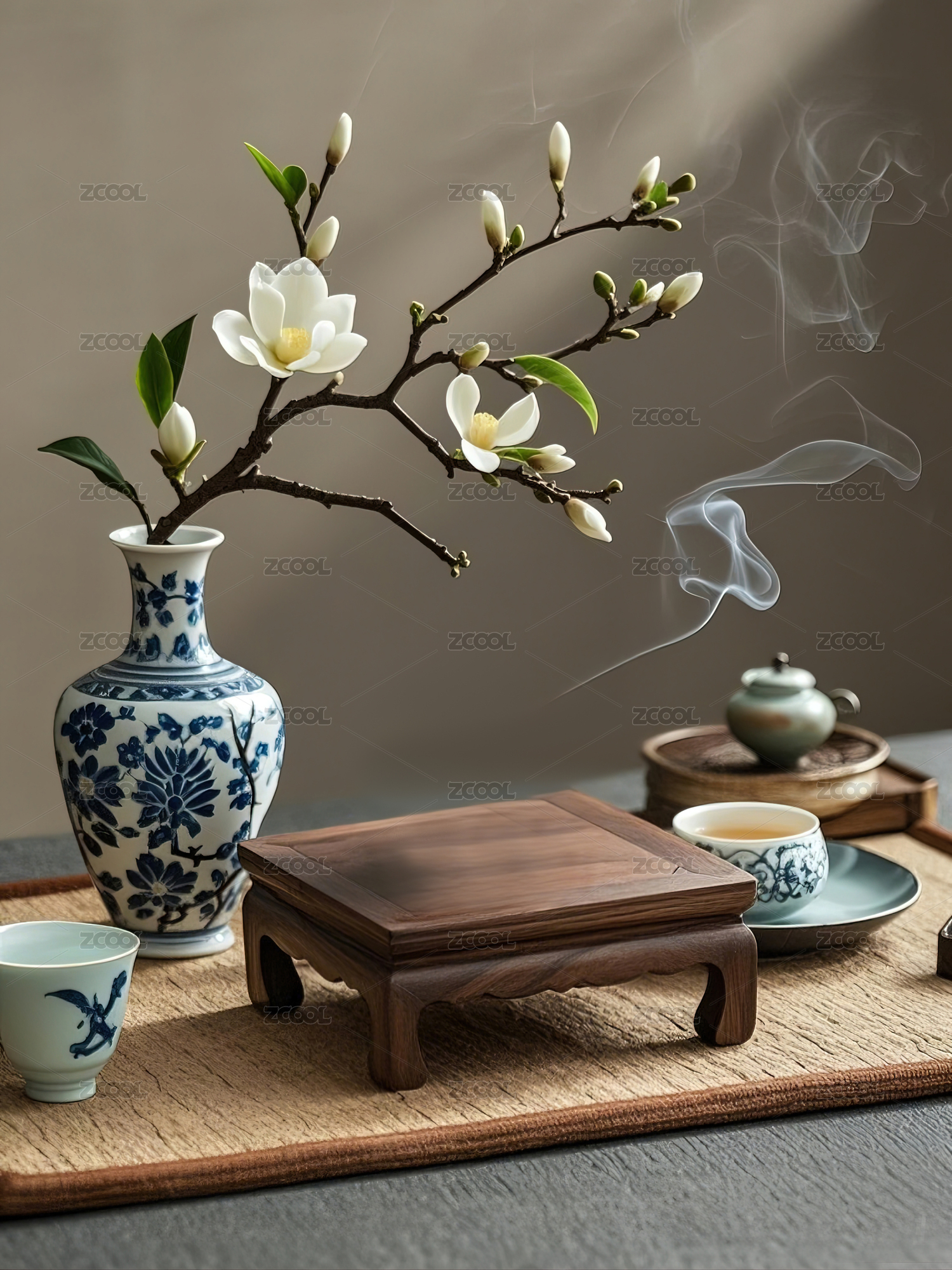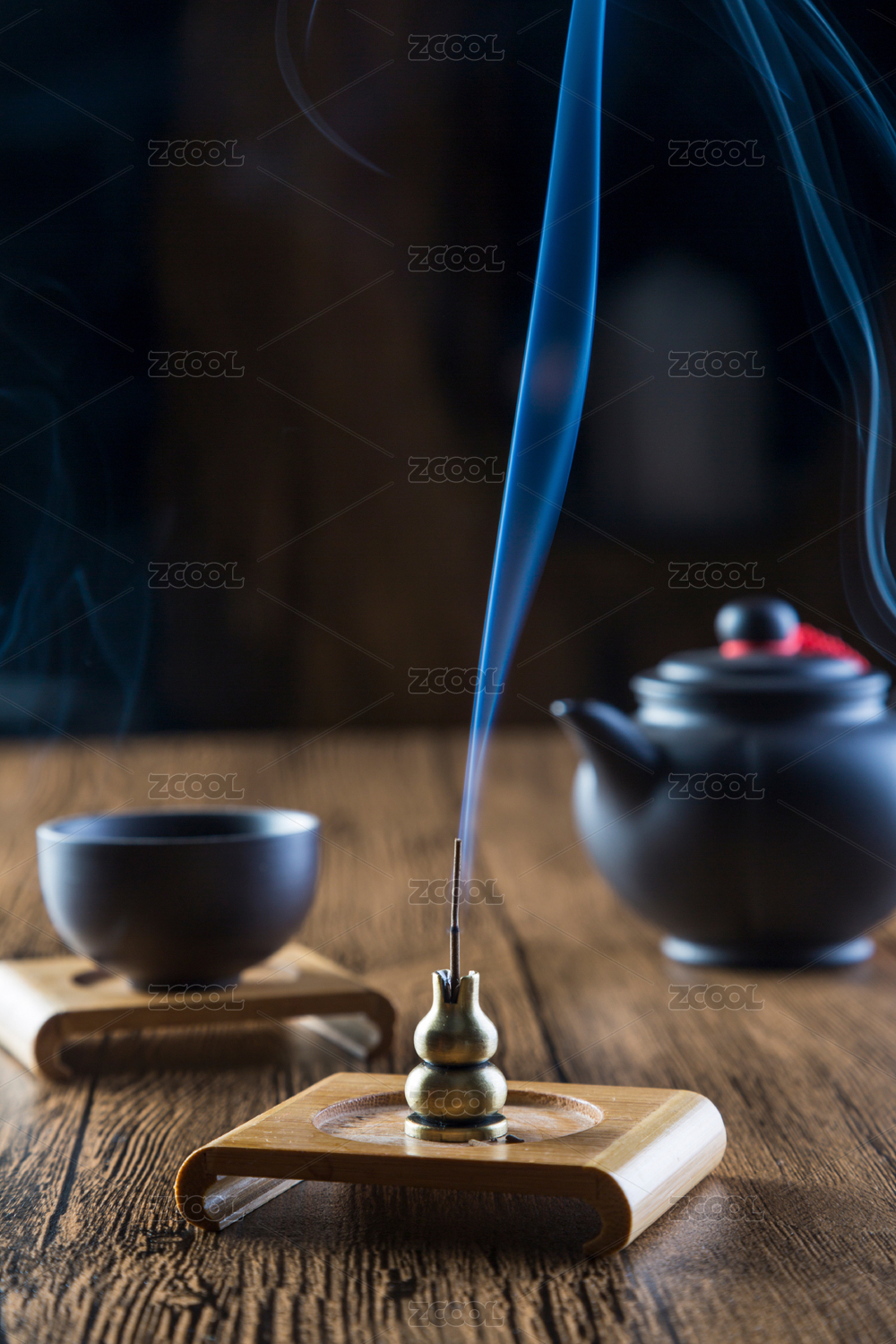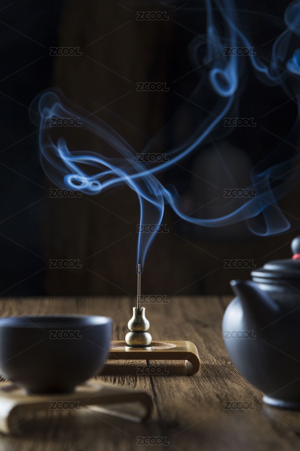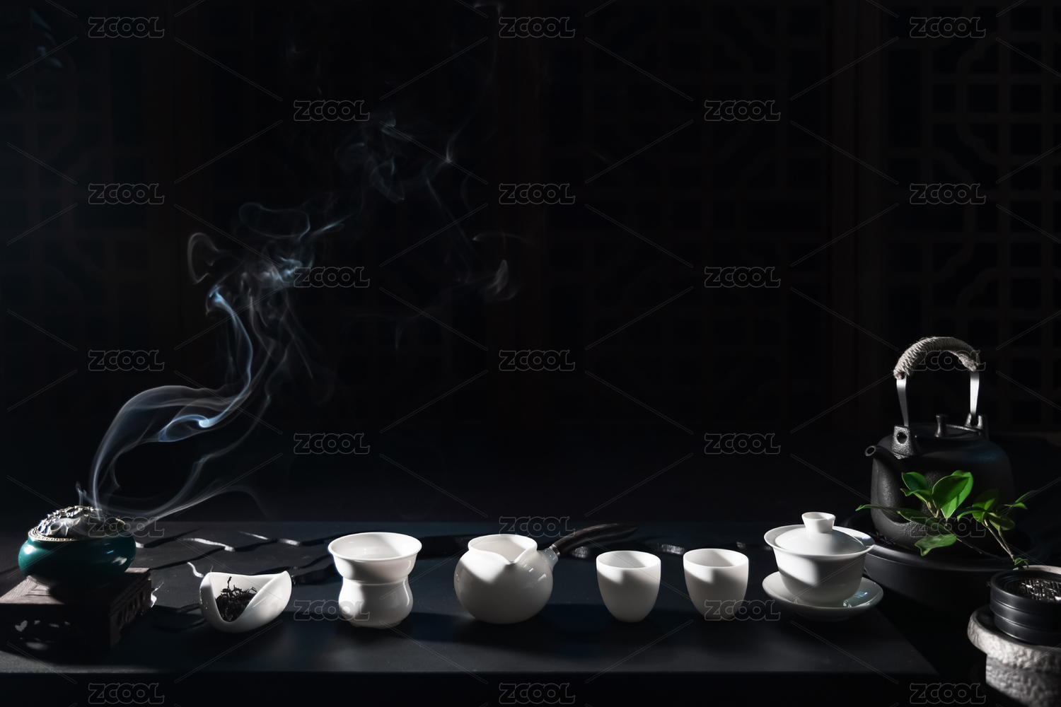 陶瓷茶具和袅袅飘散的沉香烟雾