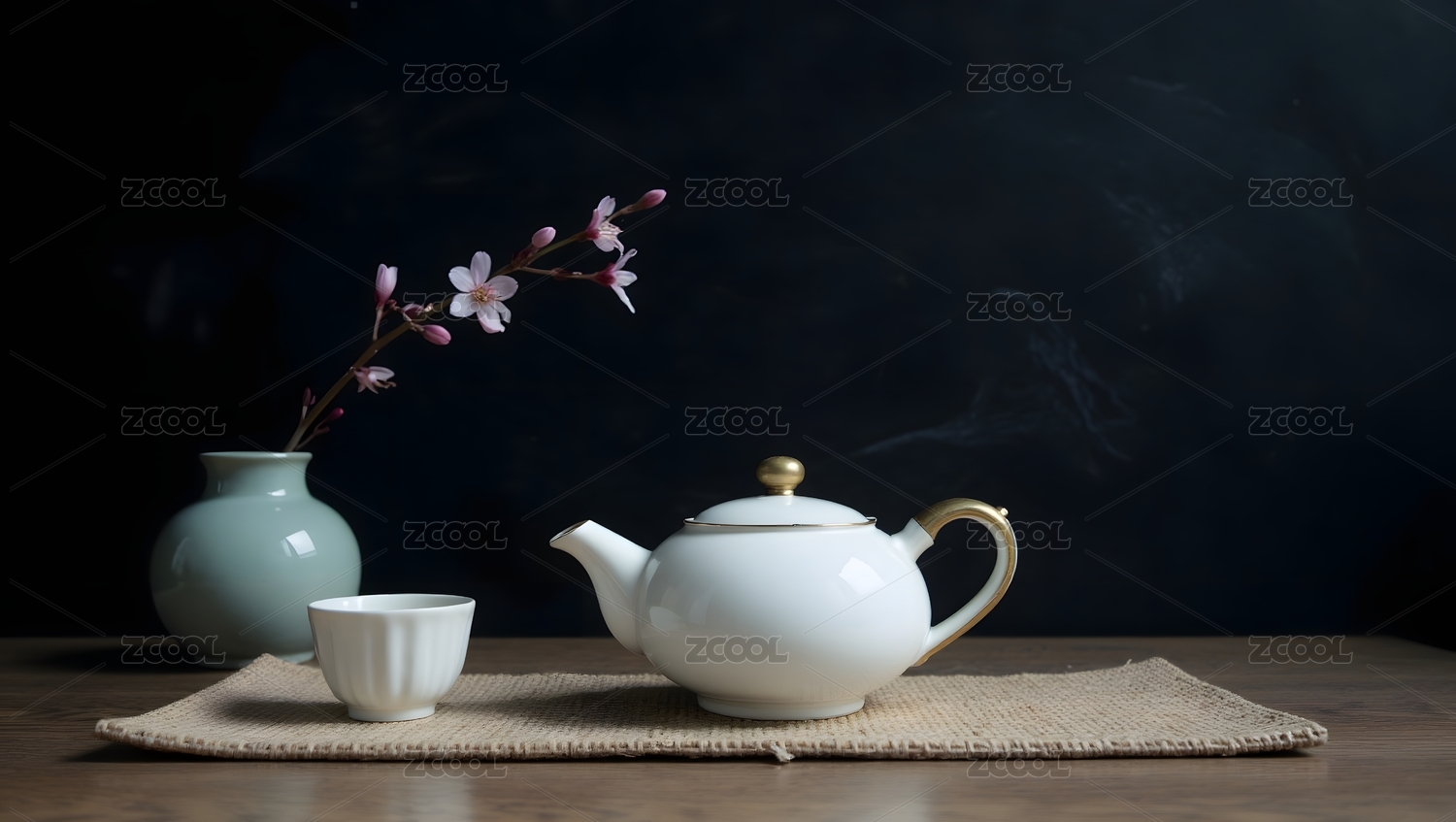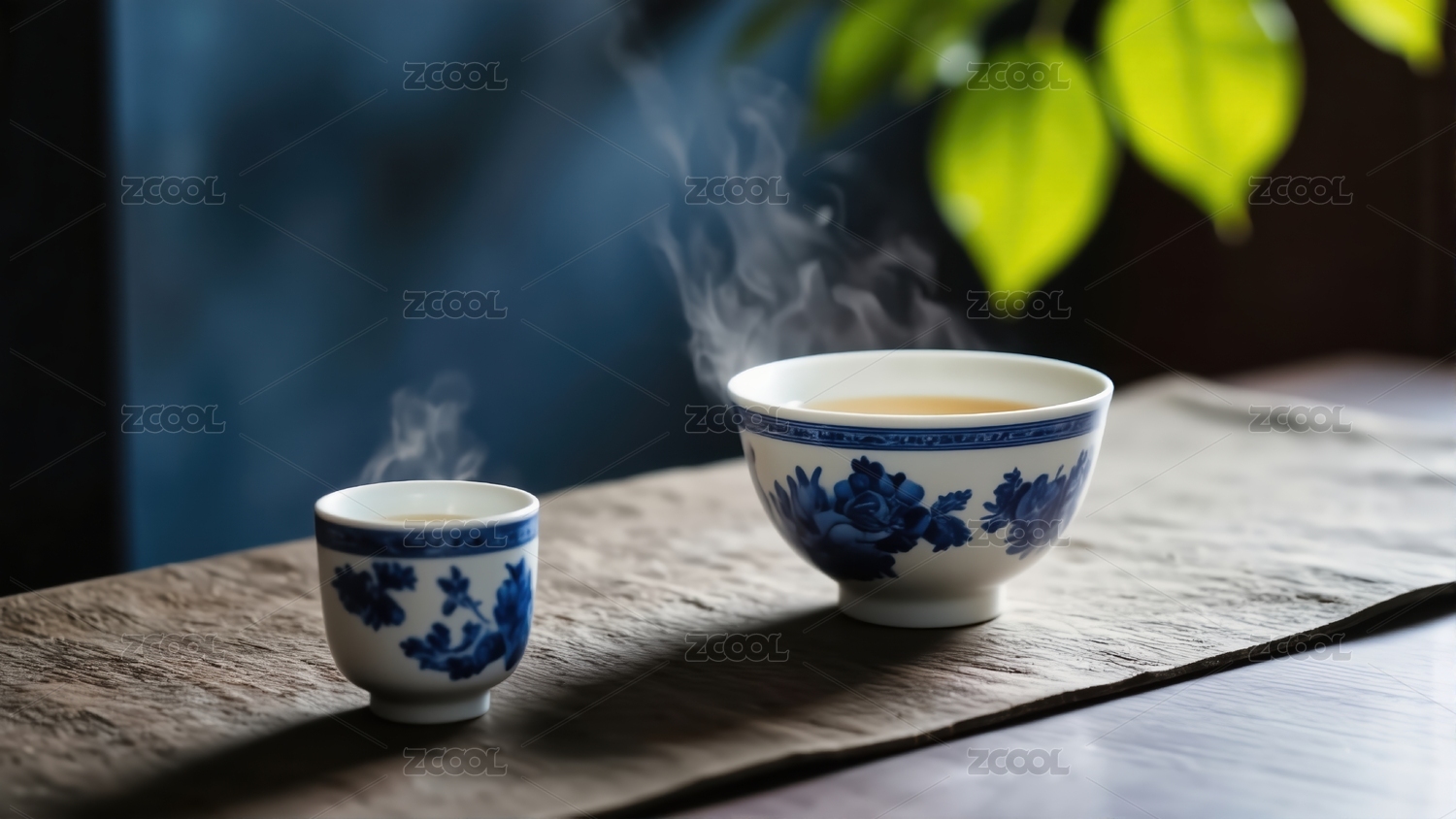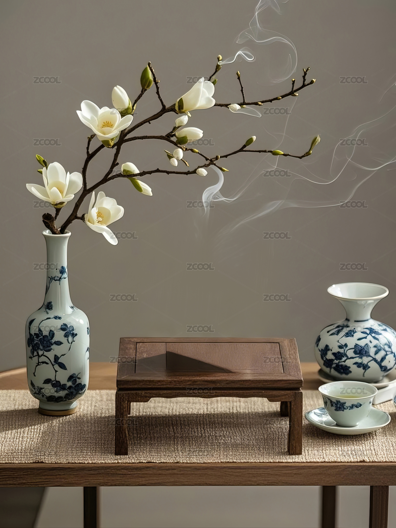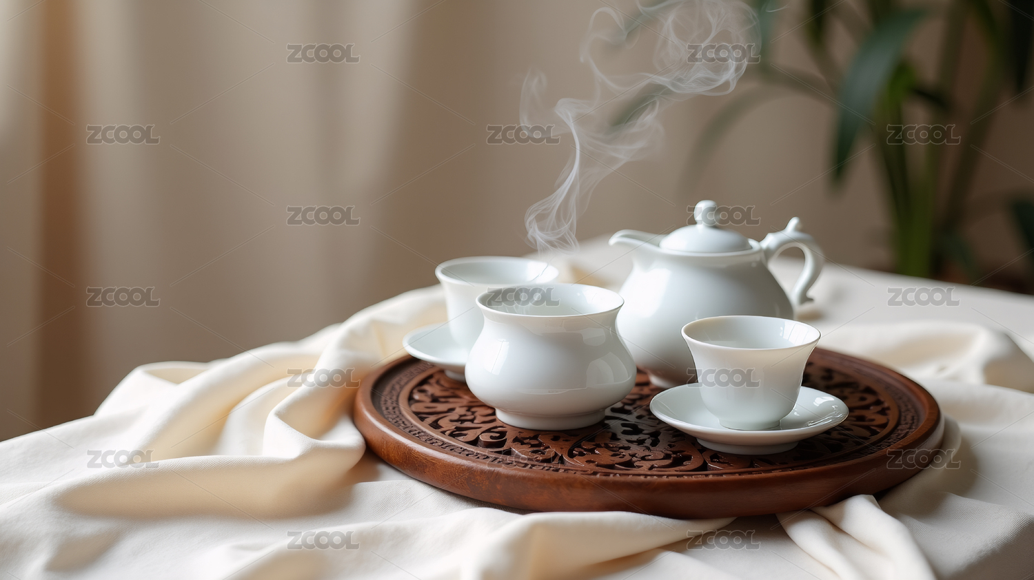 陶瓷茶具和袅袅飘散的沉香烟雾