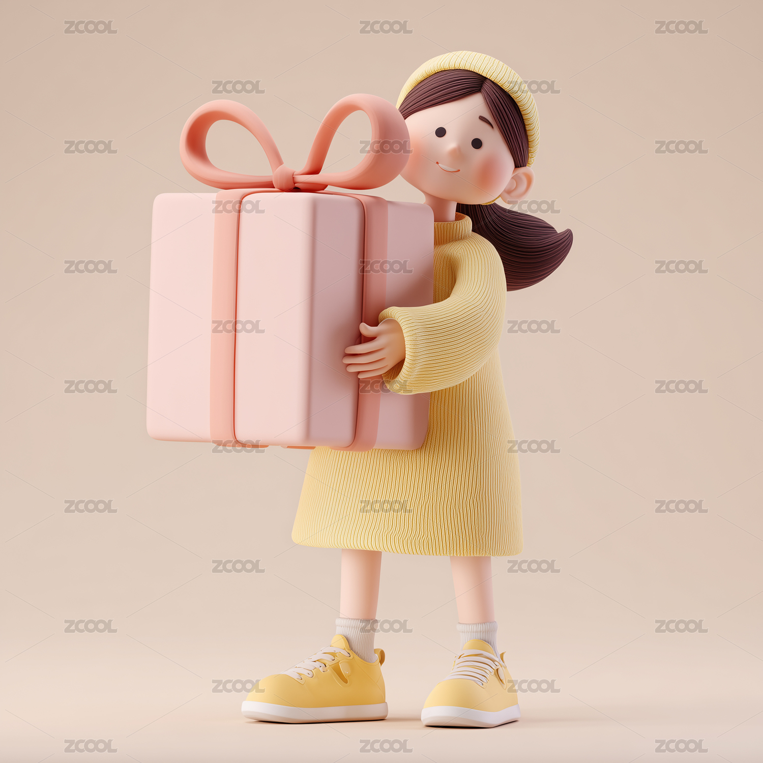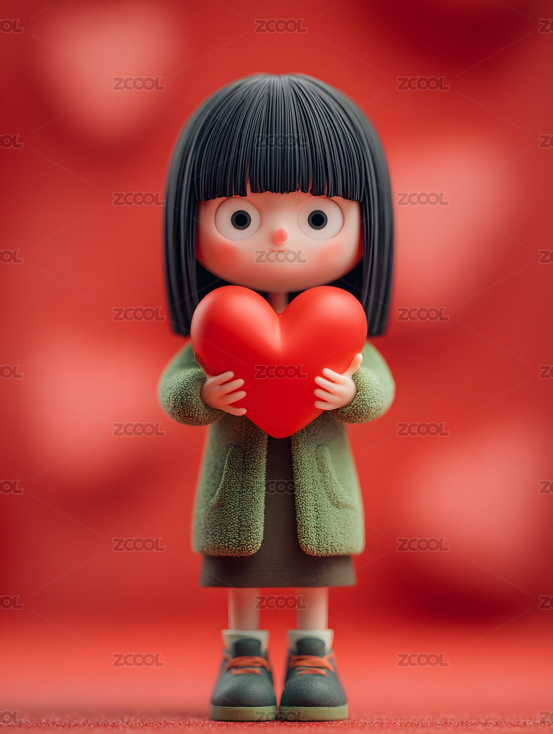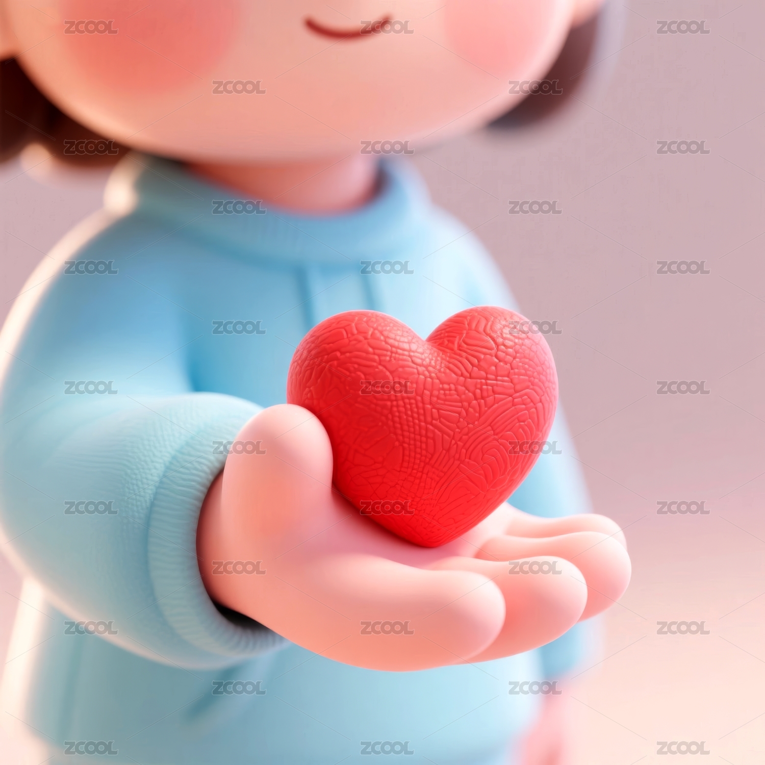 女孩手拿着爱心3D插图,感恩节情人节概念