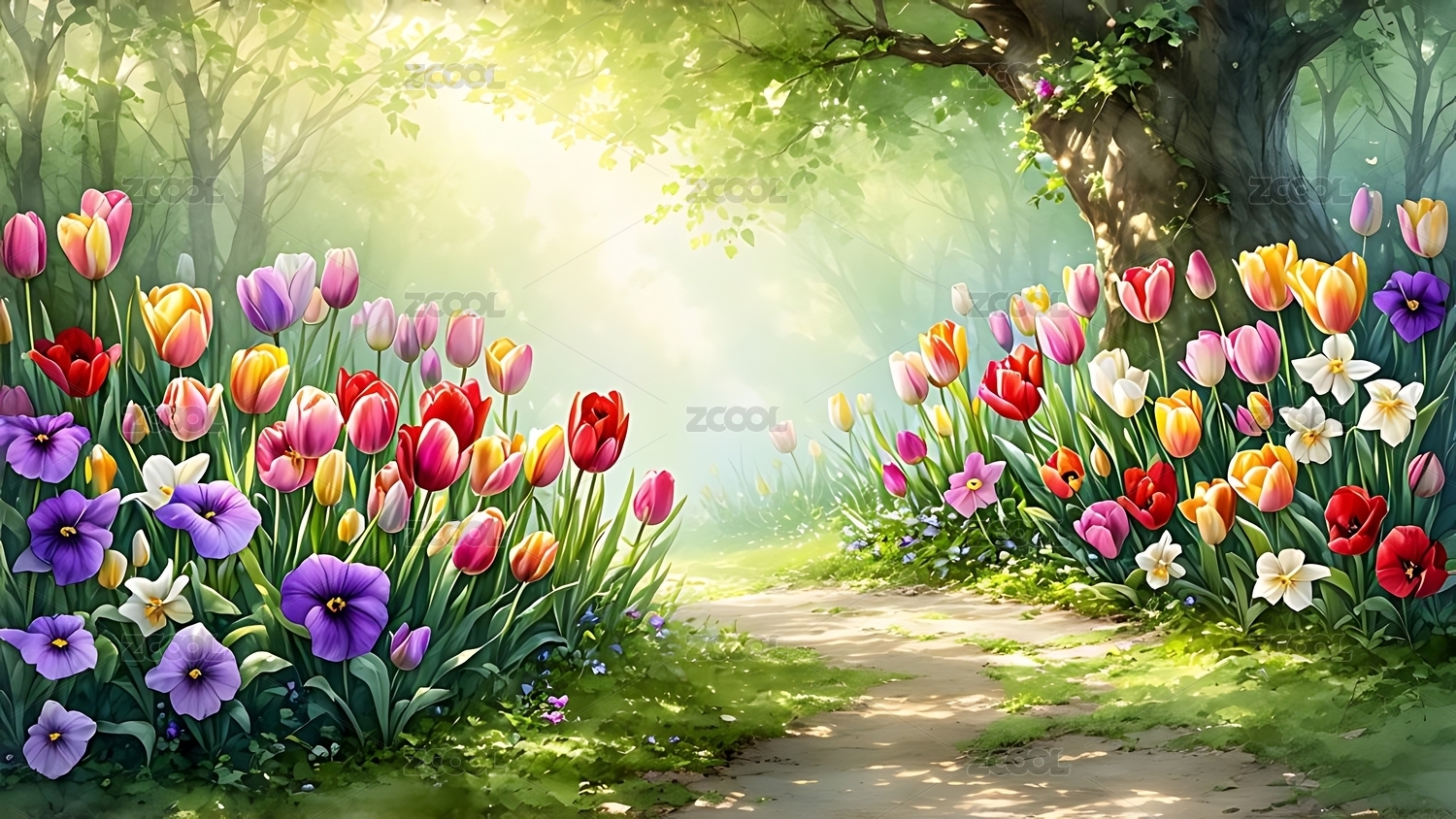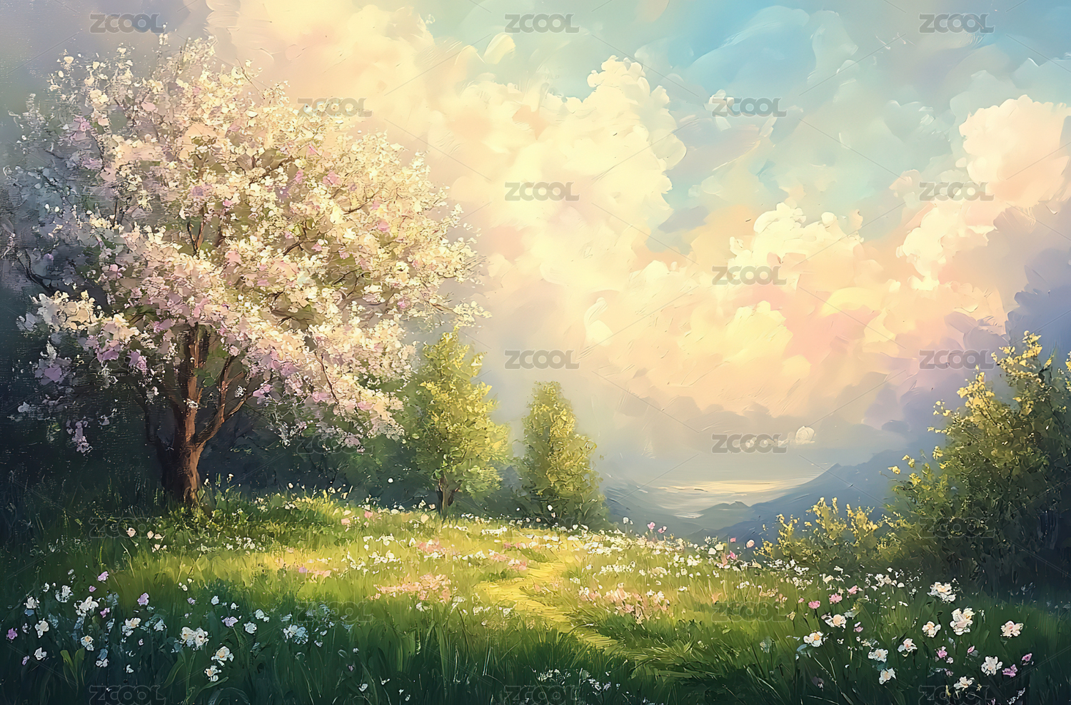 风景,景色,自然,美景,草地,树木,插画,水彩,艺术,美丽