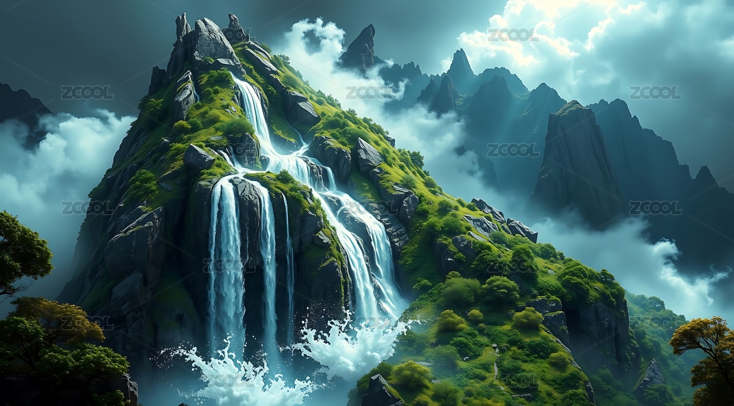 梦幻般的瀑布景观,山峦叠嶂,绿意盎然