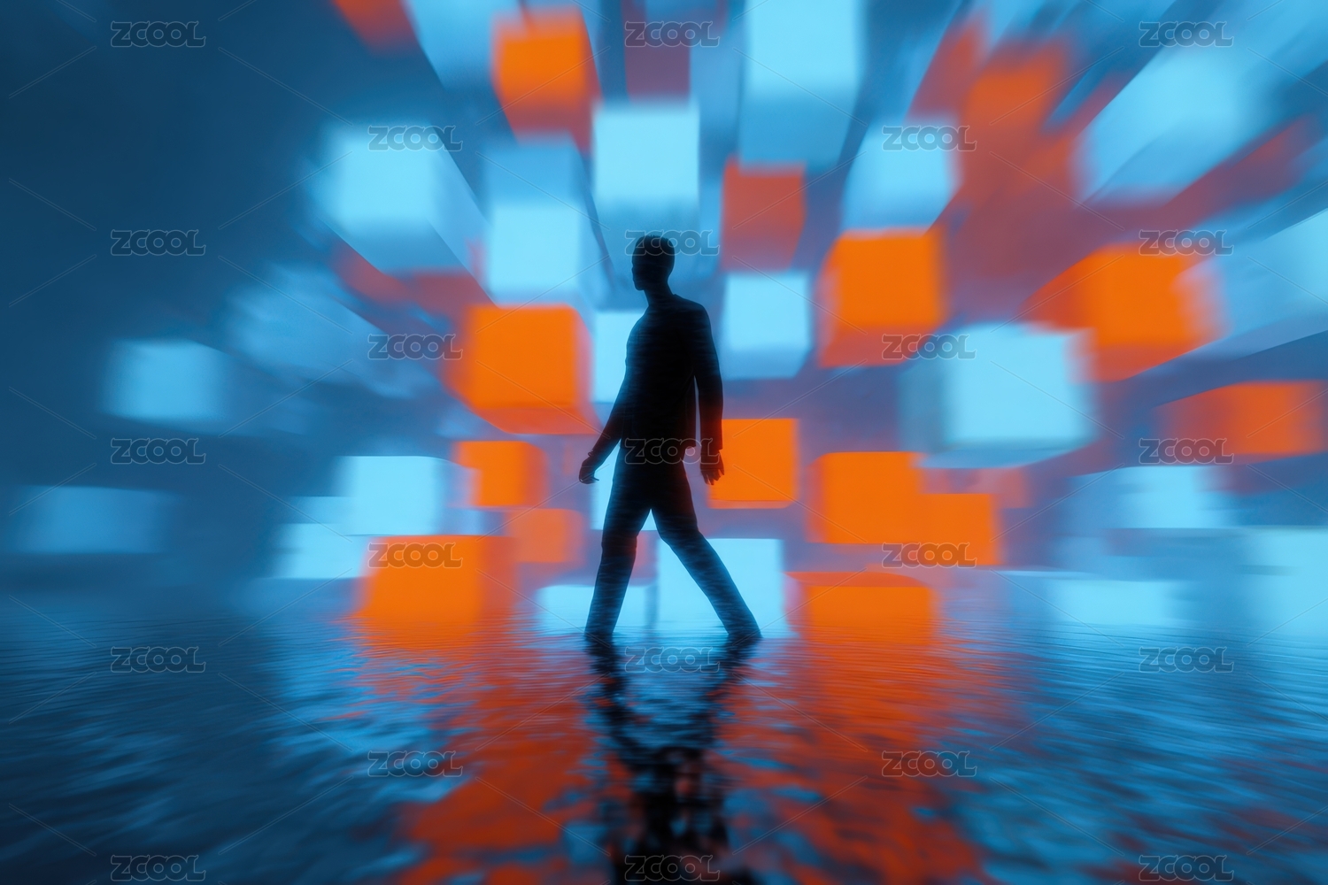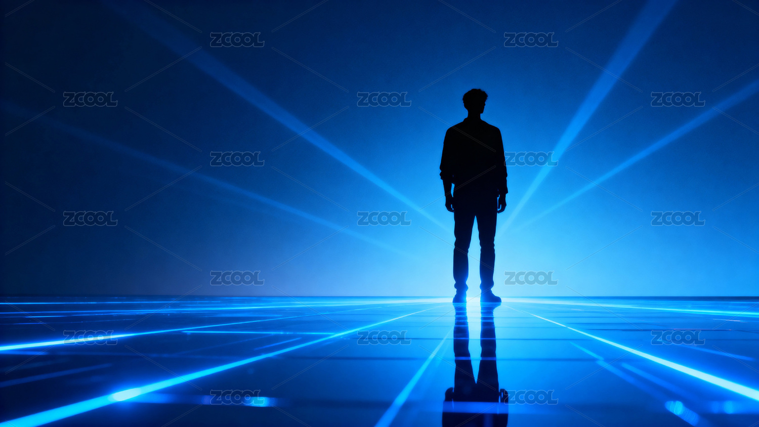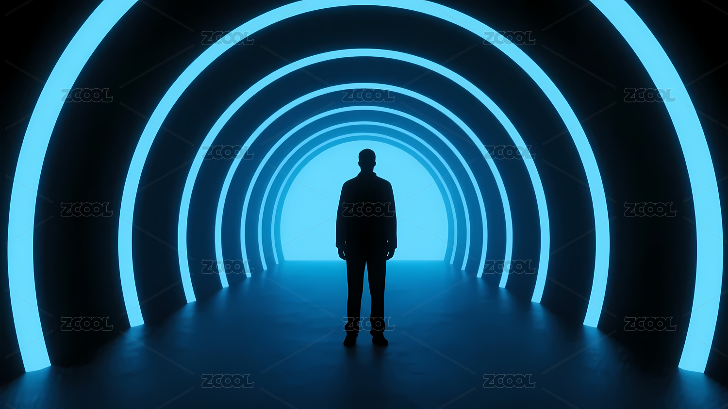 穿西装的剪影人物在蓝白渐变的发光通道行走
