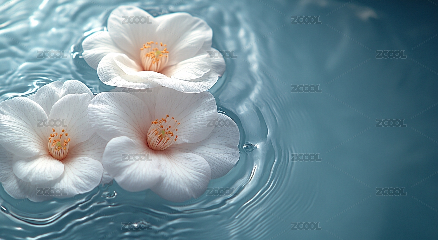 三朵白花映蓝水反射清新